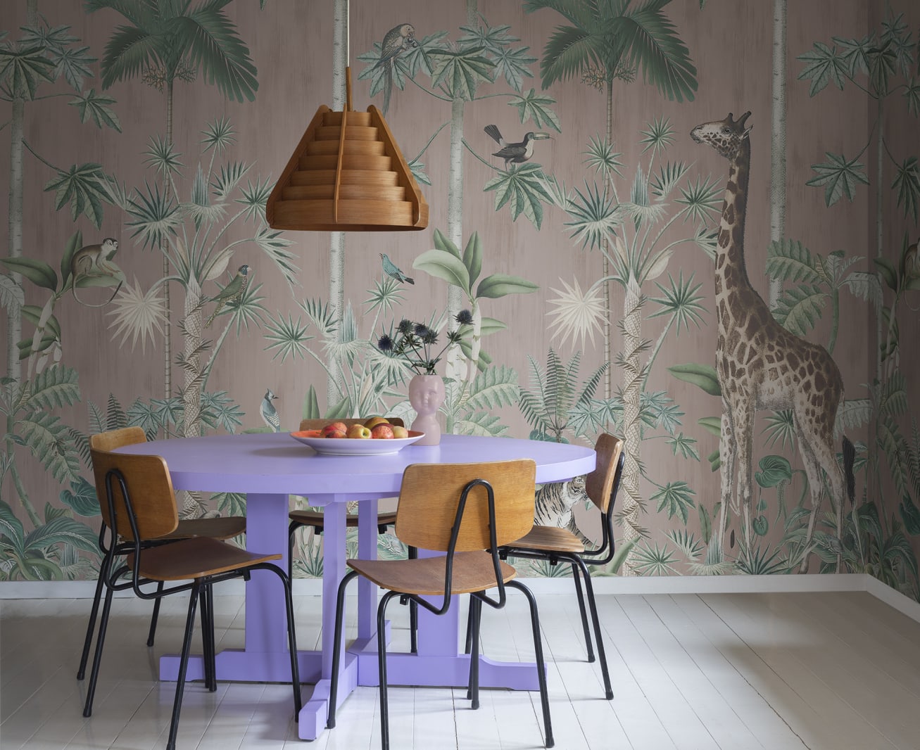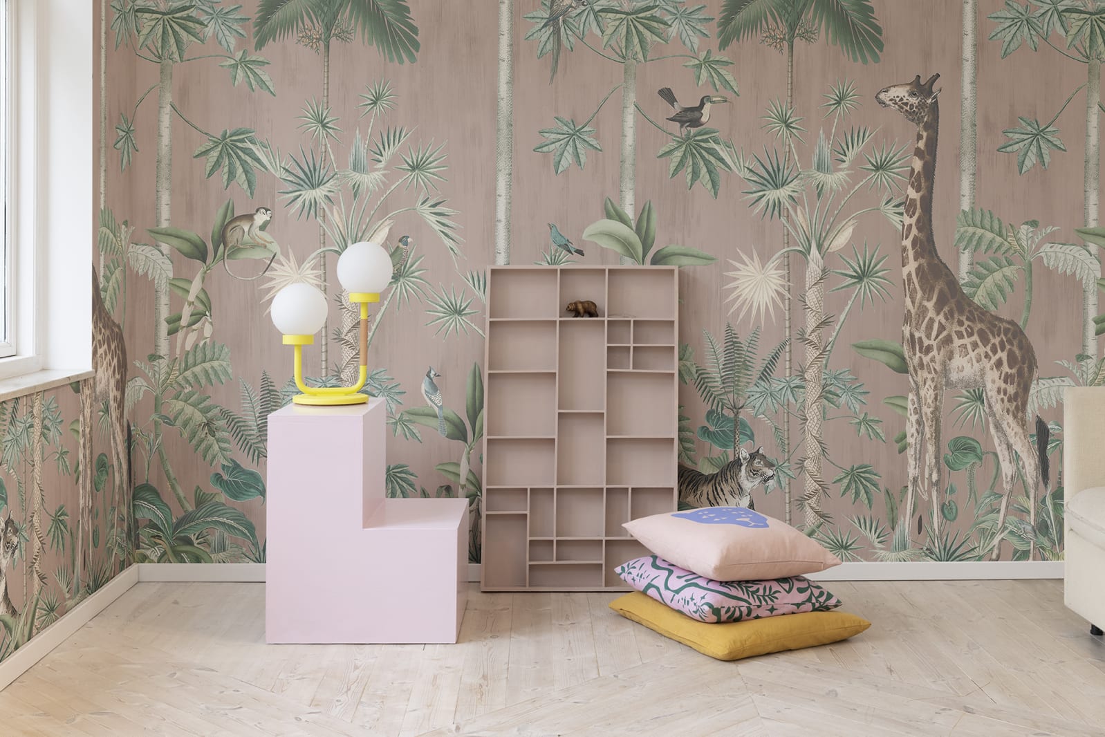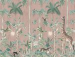 Faceți o plimbare în junglă din perspectiva unei girafe! Descoperiți toate detaliile și animalele exotice în tapetul Plimbarea girafei. Aici pe un fundal roz.