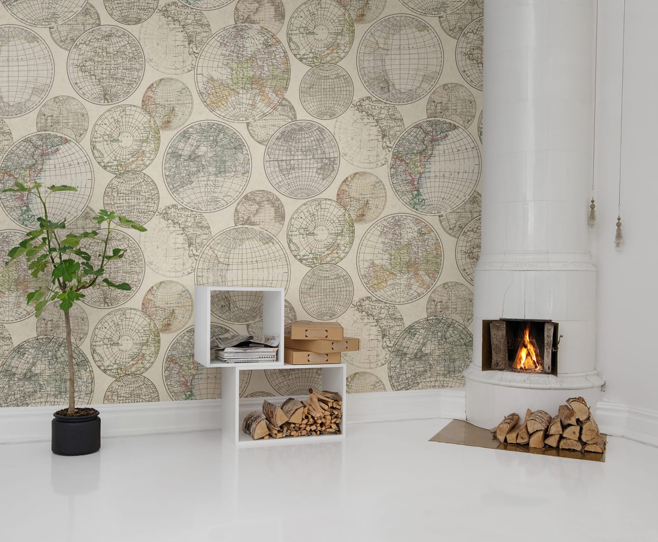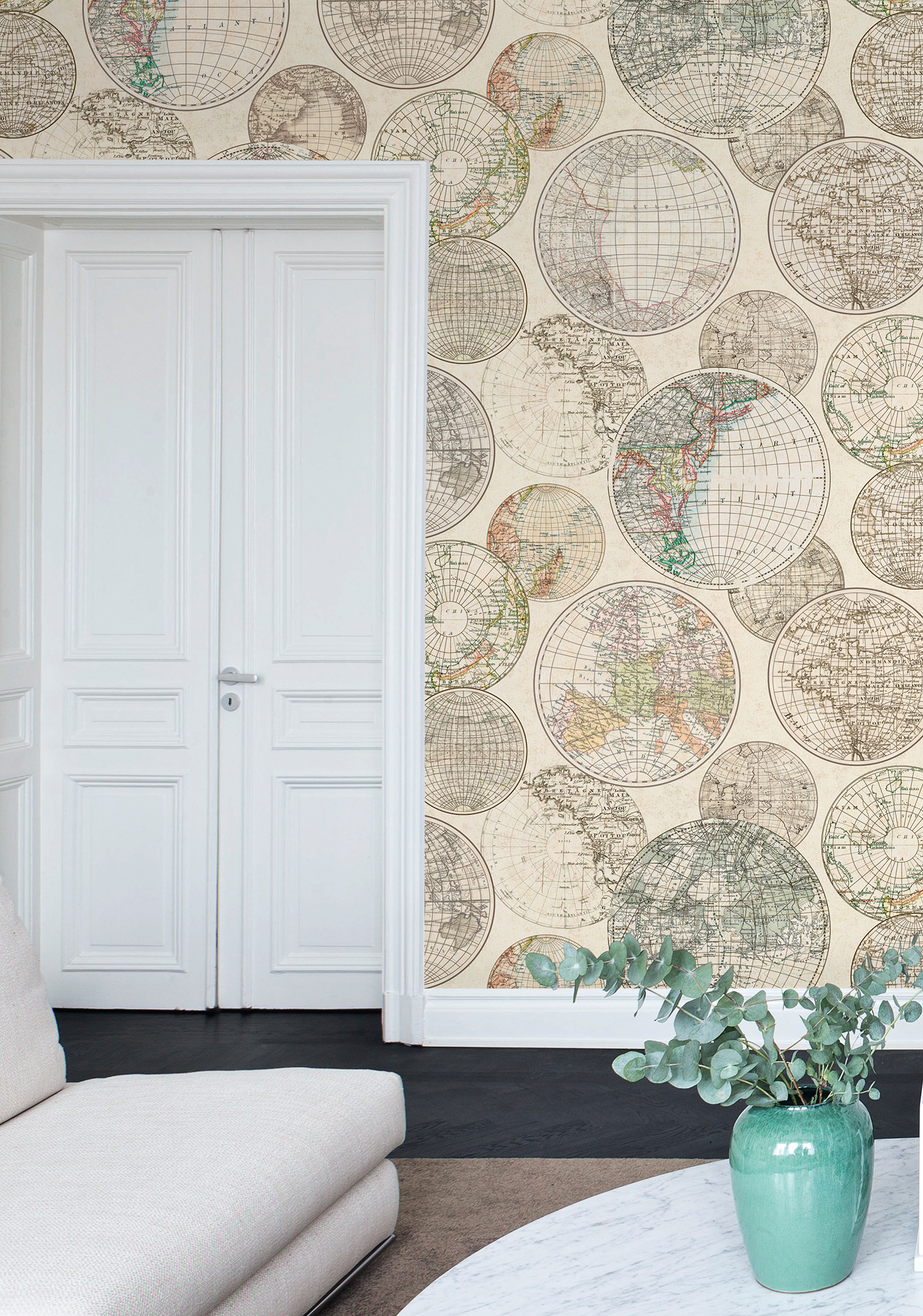 Decorează-ți camera cu o colecție de globuri. Toate au perspective diferite, continente și tări. Acest fototapet se va potrivi pe un perete mare unde cercurile pot ocupa un spațiu amplu. Un tipar dinamic a unei lumi frumoase.