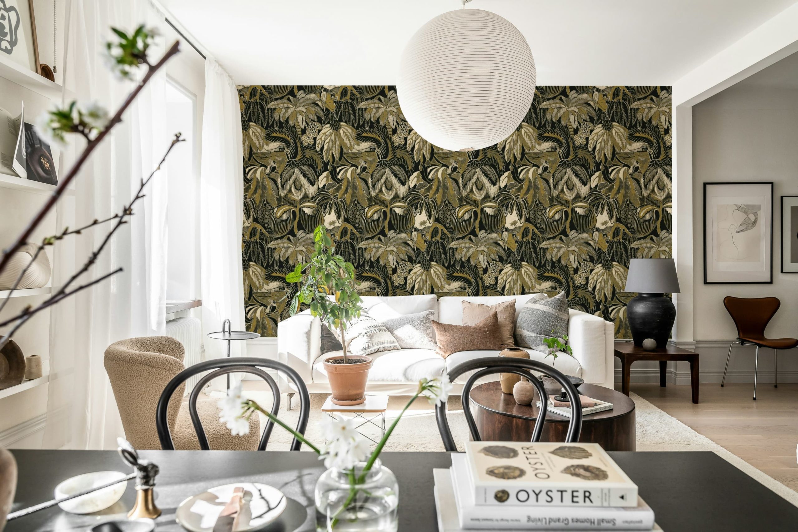 Acest tapet elegant aduce un aer sofisticat și misterios, perfect pentru un interior modern și plin de personalitate.