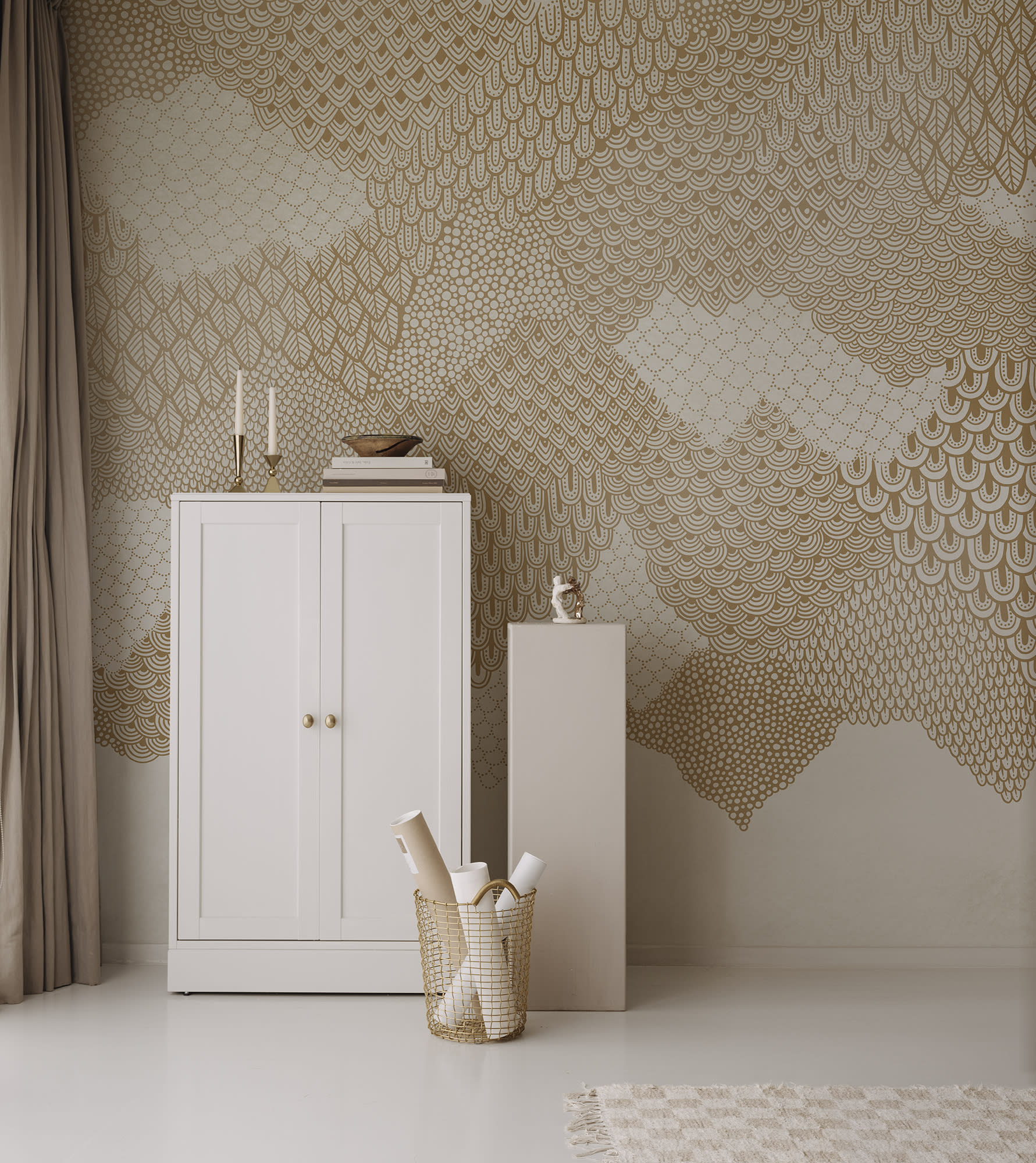 Acest model strălucitor este pictat manual de către designerii noștri. Un mural grandios care devine și mai opulent când este aplicat pe toți cei patru pereți. Designul auriu extrem de detaliat conferă un aspect exclusivist spațiului tău. Varianta Sand vine cu un lux discret, în nuanțe de bej și auriu.