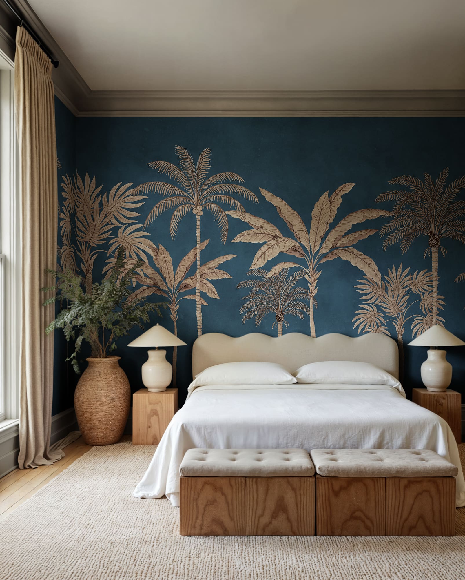 Transformă-ți casa într-o oază tropicală cu acest tapet vibrant. Designul cu palmieri aurii pe fundal albastru adaugă un aer sofisticat și relaxant oricărui spațiu. Ideal pentru living, dormitor sau birou.
