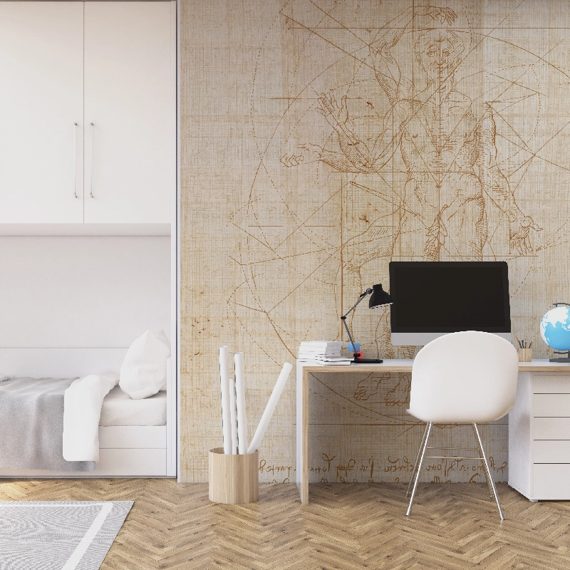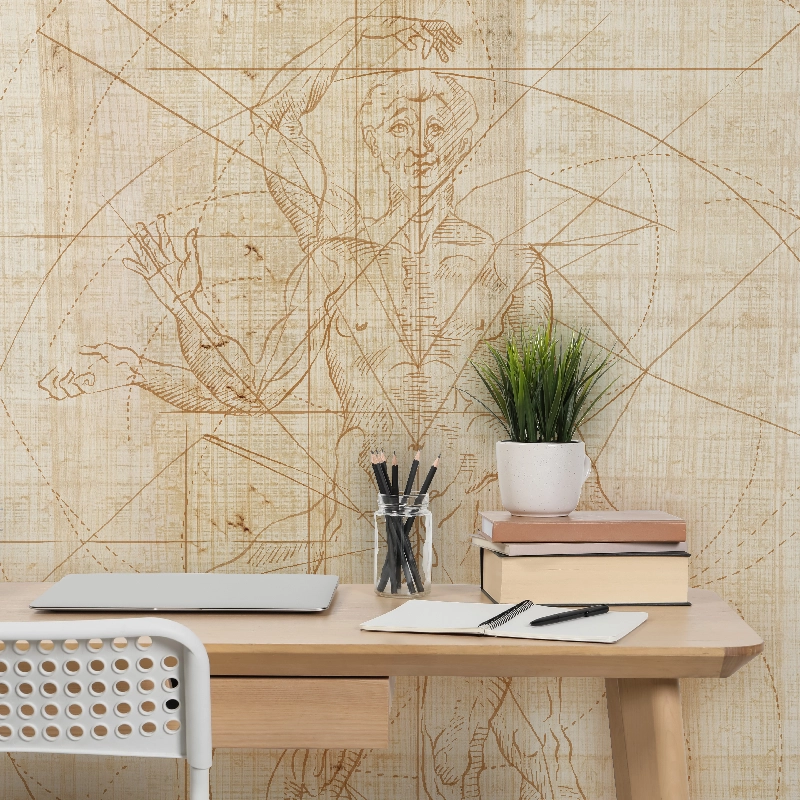 Modelul de tapet Golden Ratio reprezinta o punte intre trecut si prezent, aducand in prim-plan simulari ale schitelor si cercetarilor lui da Vinci care au stat la baza celebrei sale reprezentari, simbol al proportiei si simetriei umane. Cu grija si pasiune, modelul de tapet Golden Ratio pune in valoare eleganta si precizia pe care trebuie sa le ai atunci cand realizezi un jurnal de cercetare, sugerand proportiile perfecte ale Omului Vitruvian.