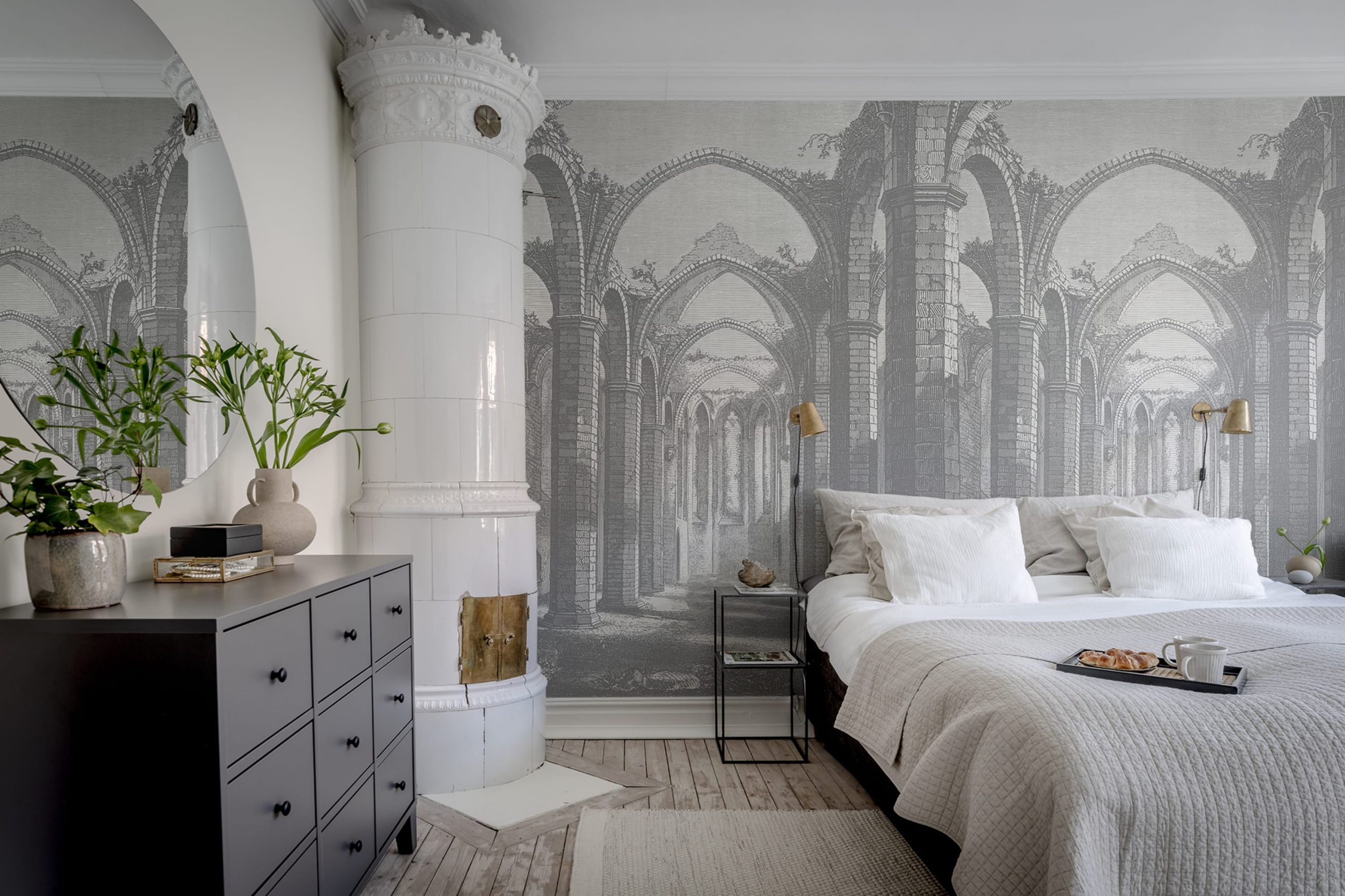 Această gravură cu arcade gotice te introduce direct în atmosfera epocii. Umbrele și ruinele spun povești din vremuri trecute. Varianta Grey induce o senzație vintage delicată. Motivul se mărește, iar arcurile adaugă adâncime și înălțime unei încăperi. Se potrivește perfect pe toți cei patru pereți.