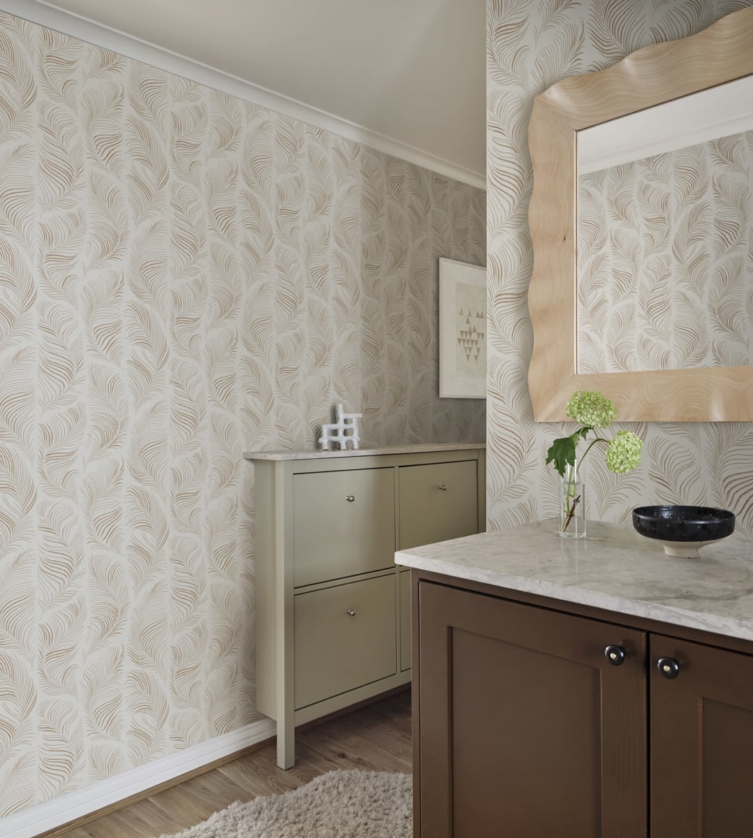 Penele elegante Art Deco în culori pământii conferă un aspect grafic moale pe perete. O versiune redesenată a unui model drag din arhivele noastre. Aici în nuanțe calde de bej și detalii de cupru.