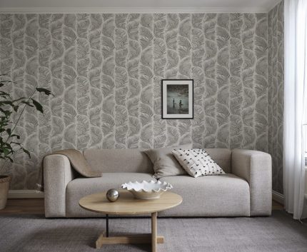 Tapetul Sigfrid blue are un model de frunze dens, care se întinde pe perete și dă camerei un aspect armonios.