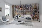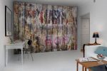 Farmec rustic, într-o prezentare modernă. Un fototapet care imită scândurile de lemn pe care sunt desenate modele graffiti colorate. Arta străzii aduce o atingere contemporană și un vizual cu totul aparte.