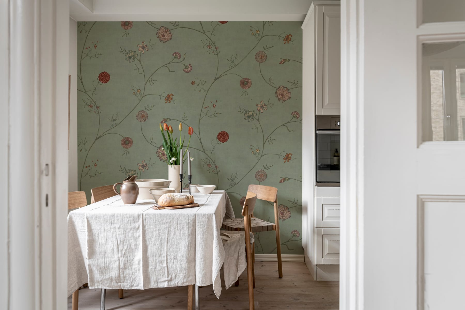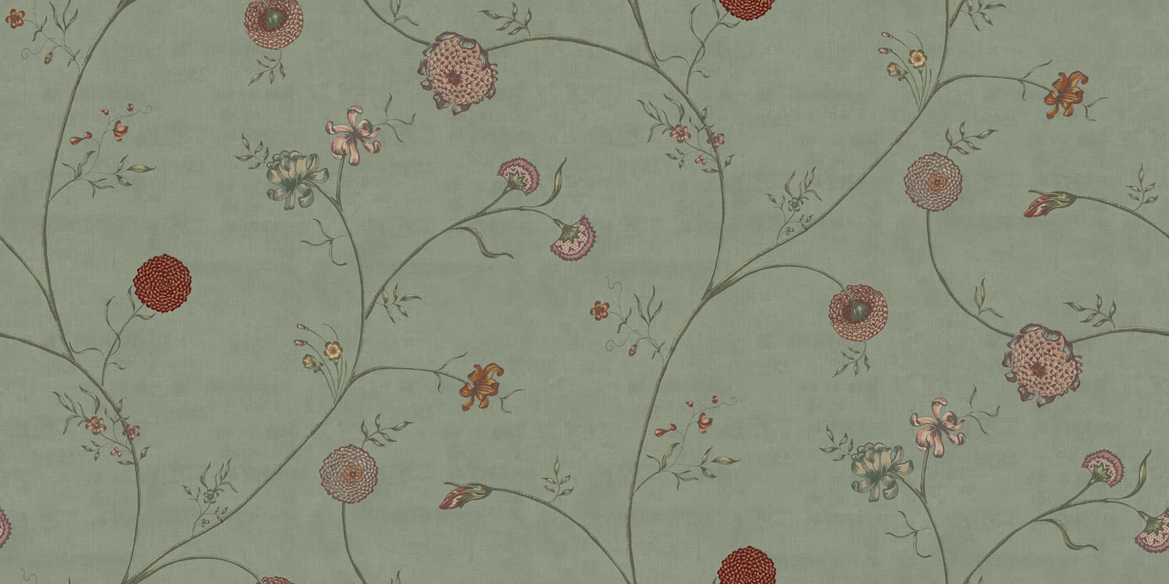 Acest model floral de dimensiuni mari este atât somptuos, cât și ușor și aerisit. Florile desenate cu măiestrie plutesc pe perete, fiind delicat conectate de tulpini grațioase. Paleta de culori „Green”, include flori delicate în nuanțe de roșu, roz și verde deschis pe o bază frumoasă și texturată de verde.