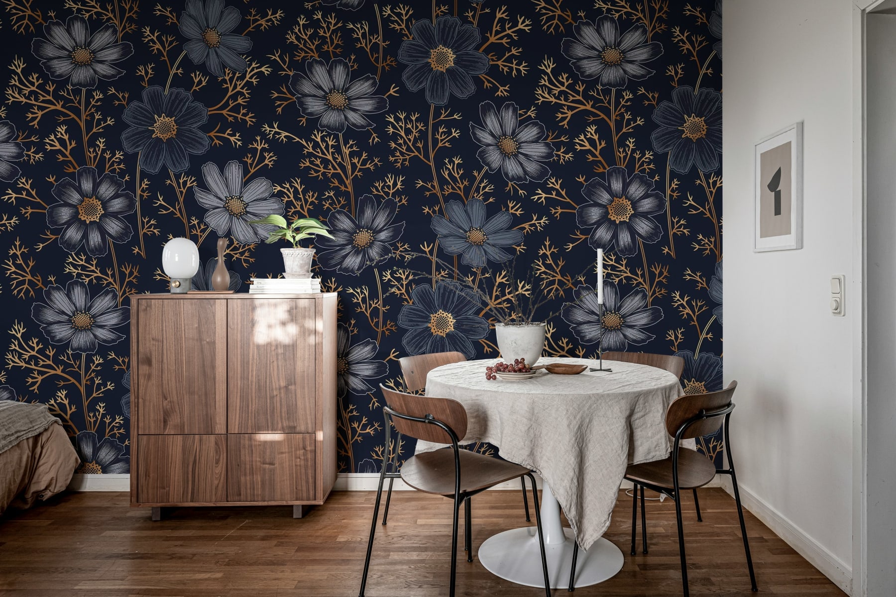 Scufundă-te în opulența „Grand Flowers, Gold”, unde fiecare perete devine o declarație de lux. Acest tapet aduce la viață un model floral excepțional cu flori albastre vibrante, conturate minuțios cu detalii strălucitoare aurii, toate așezate pe un fundal sofisticat în albastru închis. Perfect pentru a crea o atmosferă de eleganță și măreție în spațiul tău de locuit, acest design te invită într-o lume unde flora întâlnește splendoarea. Transformă-ți camera într-un refugiu de frumusețe maiestuoasă cu acest tapet captivant.
