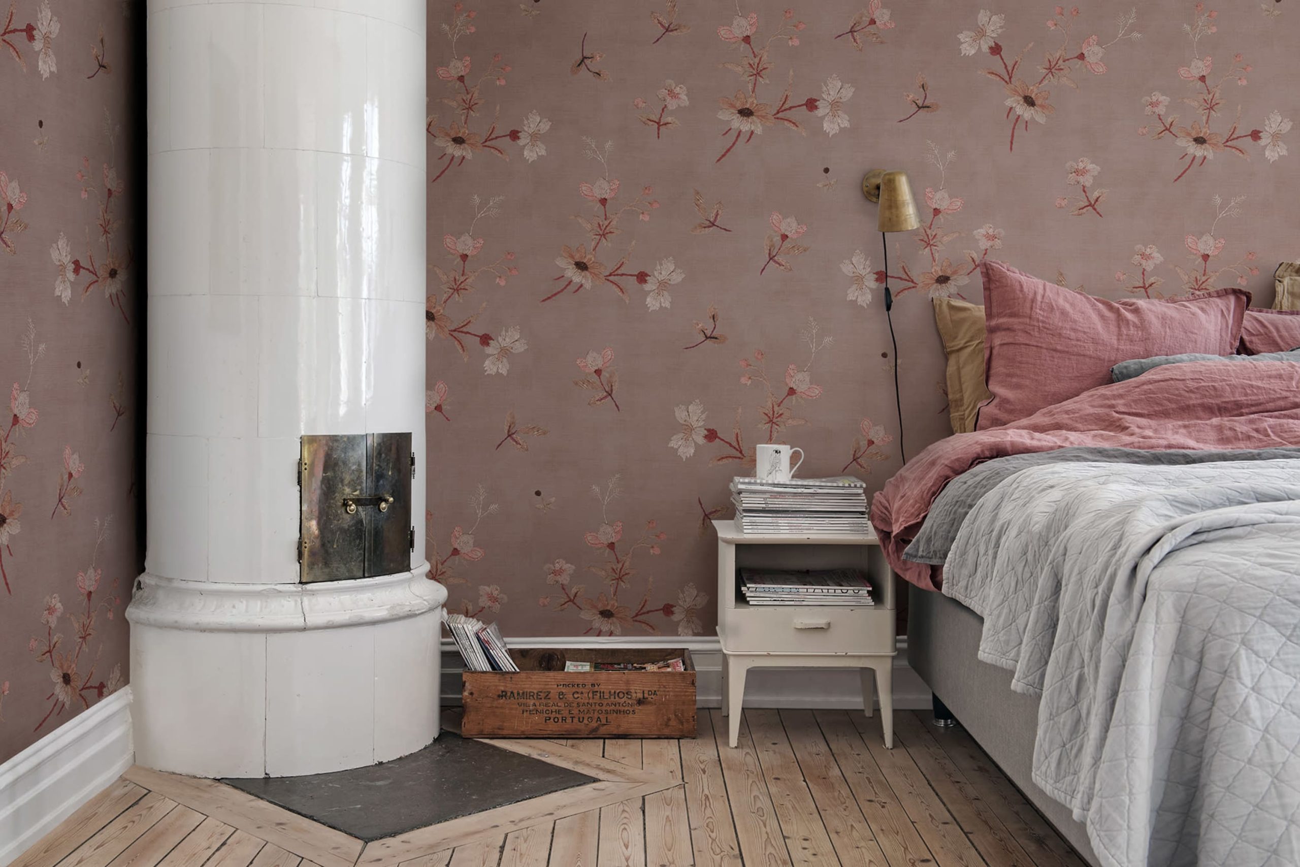 Atât de drăguț încât aproape doare. Acest tapet arată și se simte ca un material textil. Originalul este o broderie veche din secolul al XIX-lea. Acest design se potrivește în atât de multe spații, dormitoare, camere pentru copii, sufragerii și holuri, pentru a enumera doar câteva! Grandmother Dress, Pink, vine în roz sclipitor, culoarea caisei și alb pe o bază roz prăfuită.
