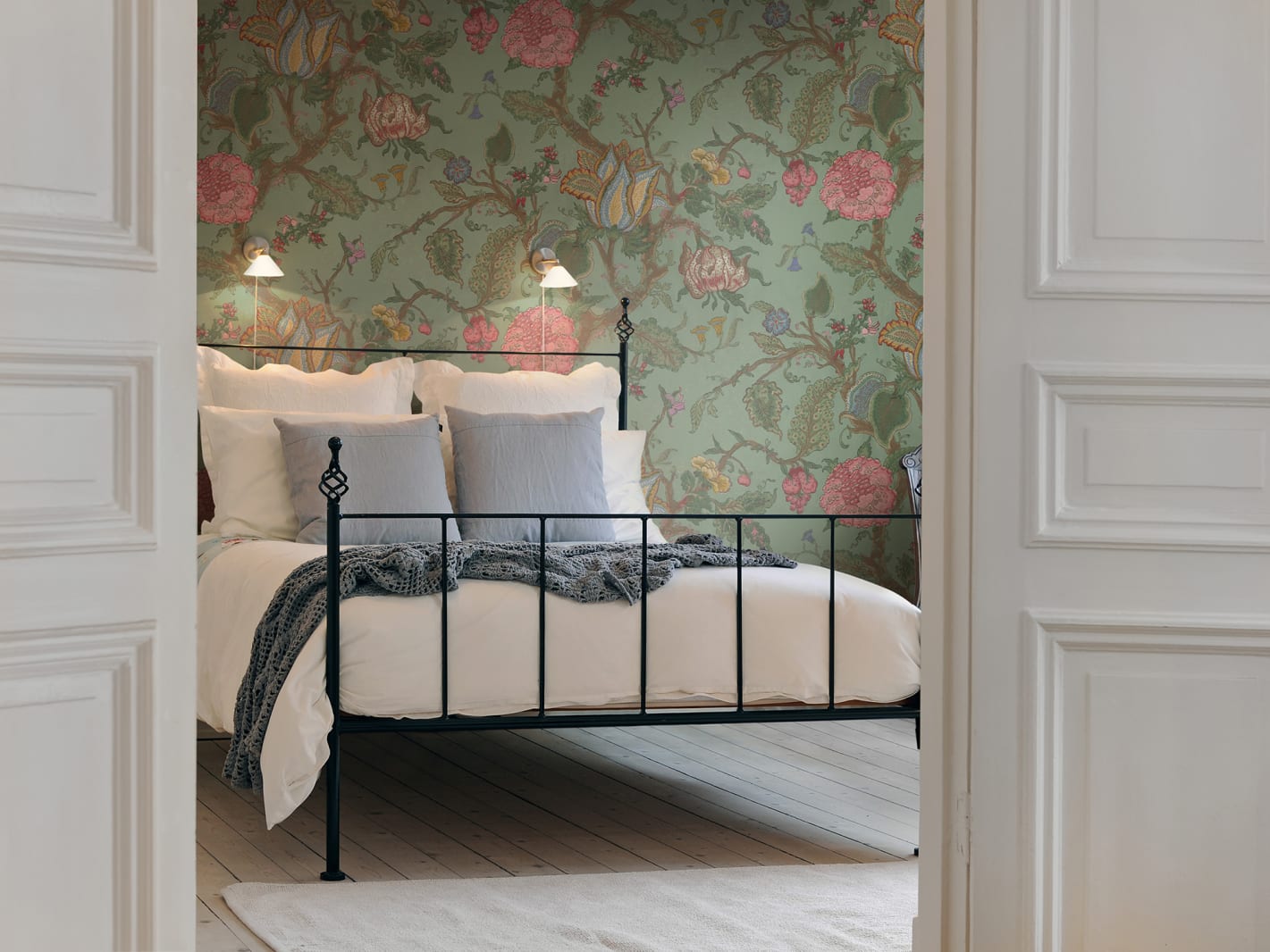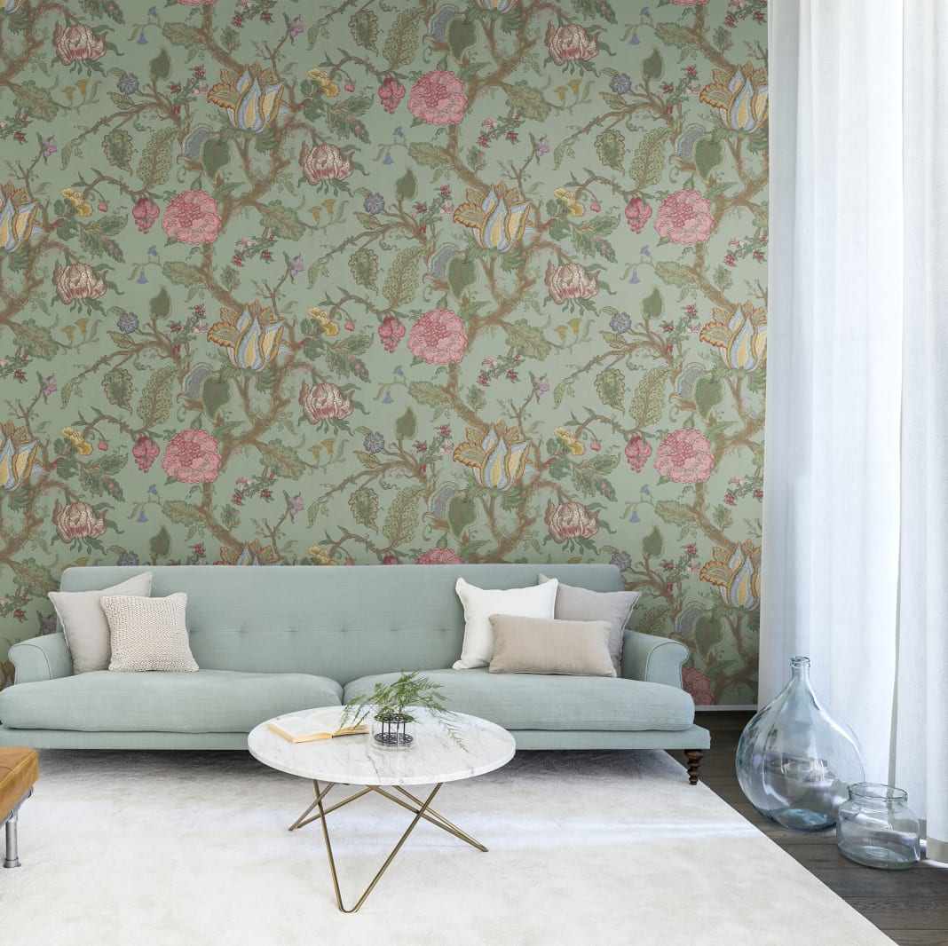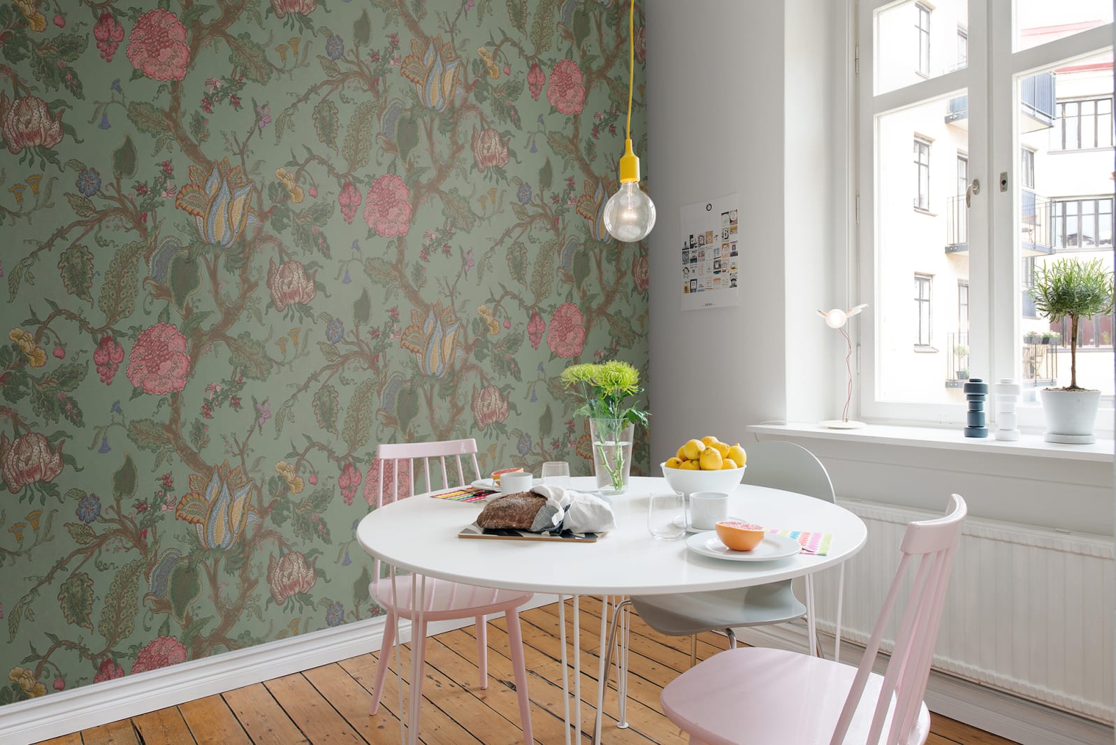Crenguțele înflorite, brodate parcă, de pe fototapetul nostru, vă aduc primăvara mereu în casă! Motivul floral delicat, în nuanțe pastelate, pe fundal verde, oferă o atingere romantică și boemă.
