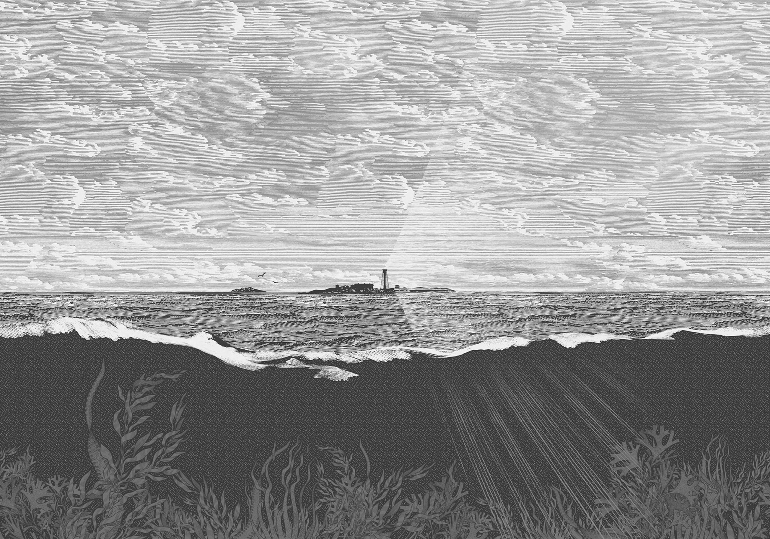 În Guiding Light, marea și pământul se reunesc într-un design detaliat cu milioane de linii și puncte, creând o vedere asupra farului Pater Noster.