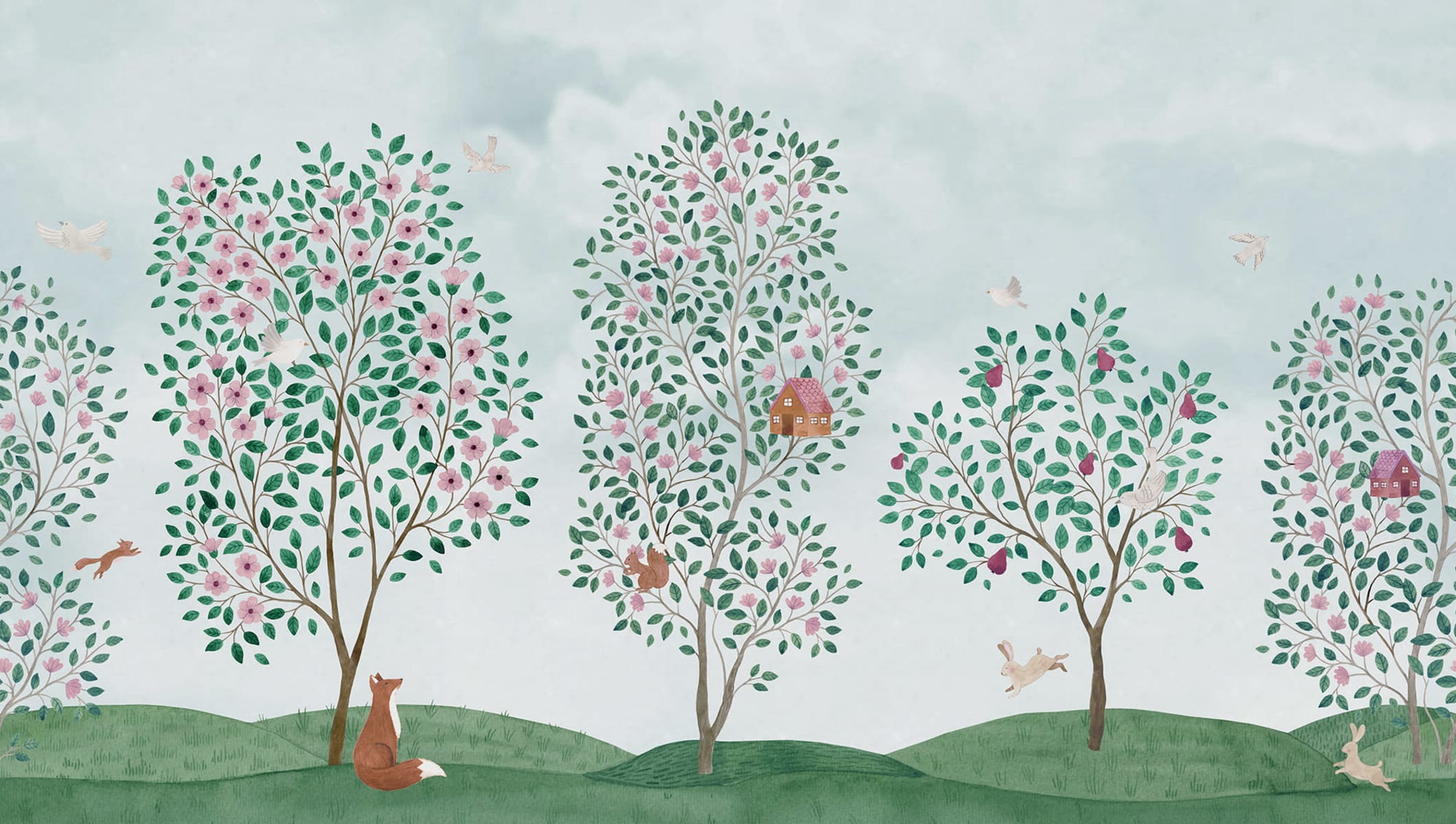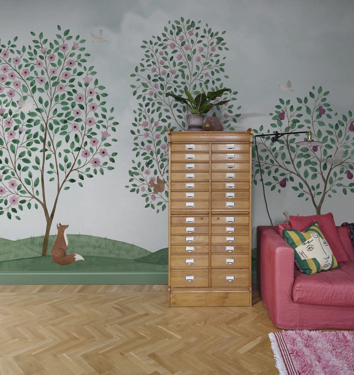 Această chinoiserie frumoasă și veselă este plină de surprize detaliate pentru întreaga familie. Puteți observa casele confortabile cuibărite în vârfurile copacilor? Culoarea verde prezintă nuanțe vii de verde, albastru, maro, roz și liliac.