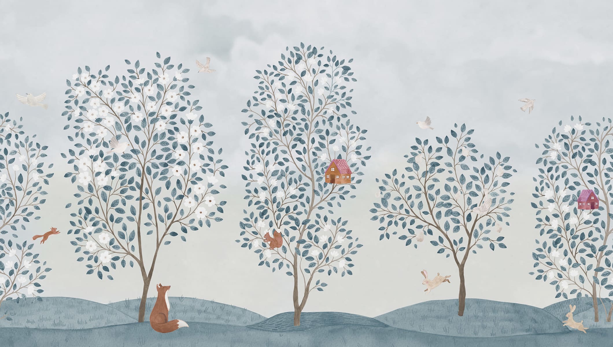 Această chinoiserie frumoasă și veselă este plină de surprize detaliate pentru întreaga familie. Puteți observa casele confortabile cuibărite în vârfurile copacilor? Culoarea Light Blue are o bază albastru deschis și un model complicat în nuanțe superbe de albastru, maro și violet.