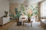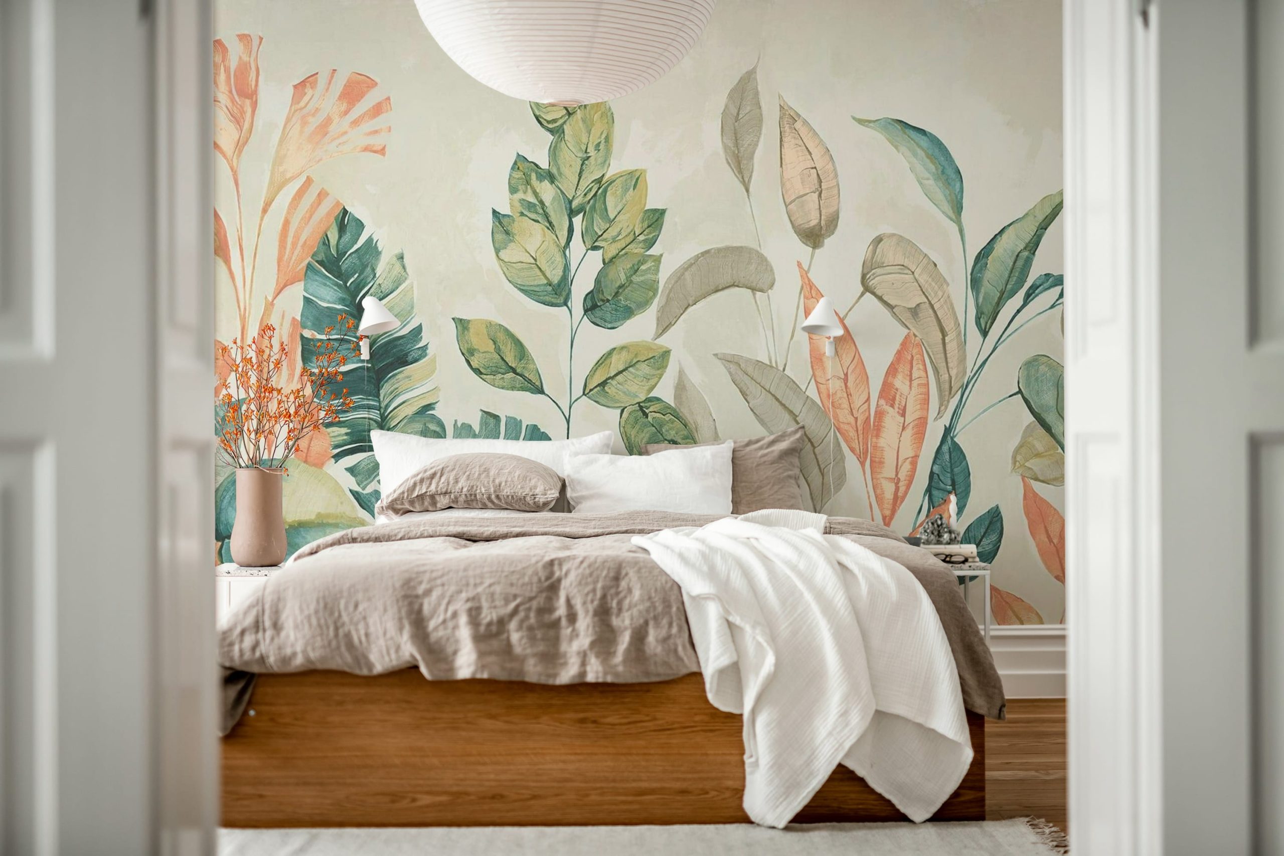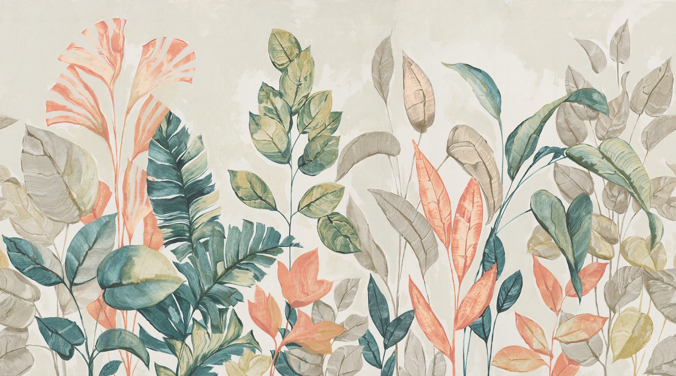 Acest fototapet aduce un suflu proaspăt și vibrant oricărui interior. Designul cu plante în nuanțe pastelate creează o atmosferă relaxantă și primitoare.