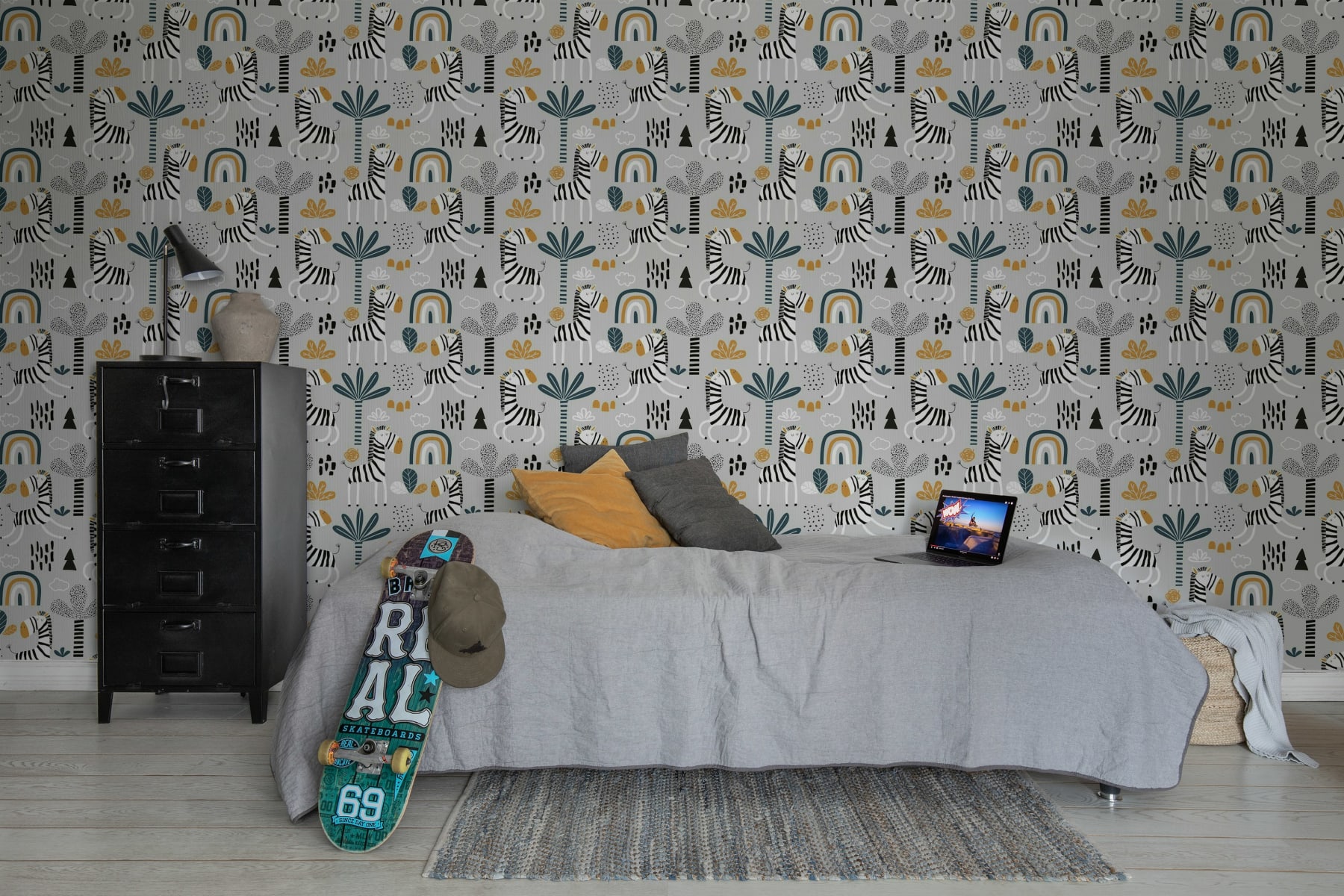 Intră într-o lume unde capriciile domnesc cu Happy Zebra, Gray. Acest tapet captivant este o simfonie de zebre jucăușe, palmieri tropicali și curcubee în nuanțe delicate, toate pe un fundal gri liniștitor. Aici, serenitatea și distracția se contopesc, creând un fundal care este la fel de potrivit pentru un colț de citit cât și pentru o cameră de copii plină de energie. Tonurile neutre și răcoroase fac din acest design o alegere versatilă, aducând un strop din farmecul savanei în jungla urbană. Eliberează puterea imaginației și lasă acest model încântător să transforme pereții într-un pânză cu escapade pline de bucurie.