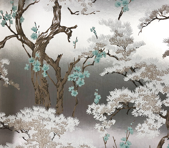 Imprimat folosind tehnica tradițională de imprimare a suprafeței, Harewood foil păstrează frumosul finisaj pictat manual, care va face cu siguranță o declarație dramatică în orice spațiu. Imprimat pe o bază de folie metalică pentru calități reflectorizante magnifice, arborele din arhivă a fost adus la viață în câteva variante de culori.
