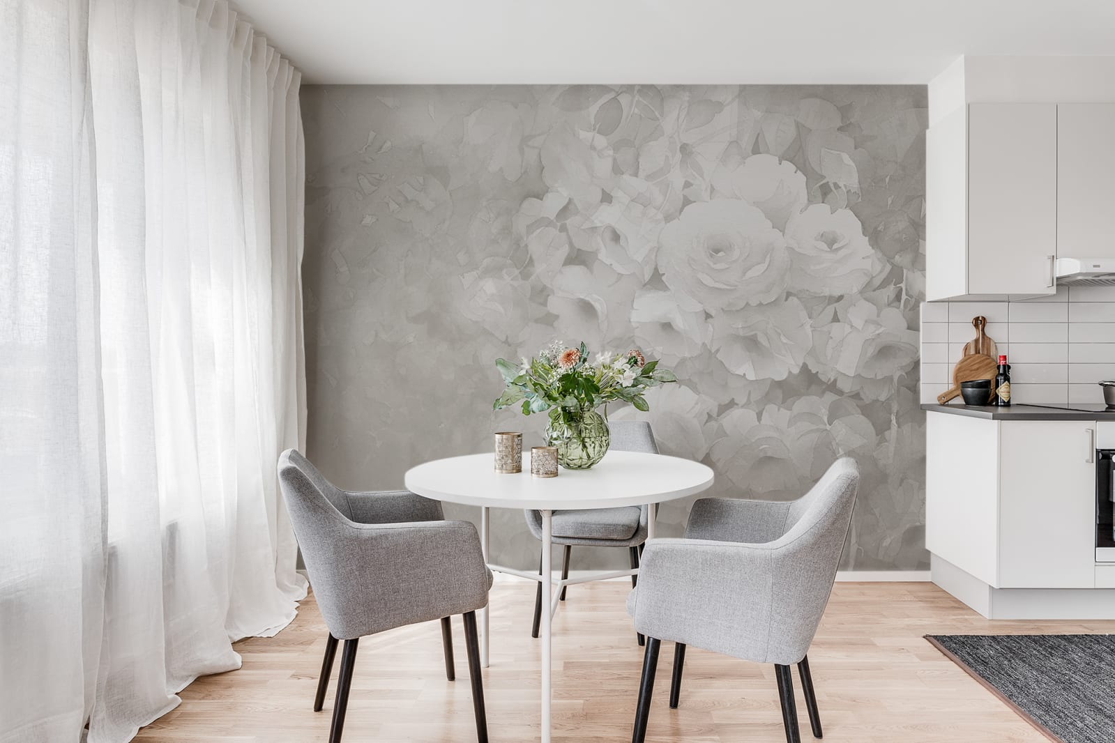Fototapetul personalizat 3D Harmony, Gray, de la Rebel Walls, cu trandafiri care par pictați, într-o combinație de alb și gri deschis, are o eleganță delicată, care va înfrumuseța orice încăpere a locuinței. Este armonios și versatil și poate fi utilizat pentru decorul în livinguri și dormitoare.