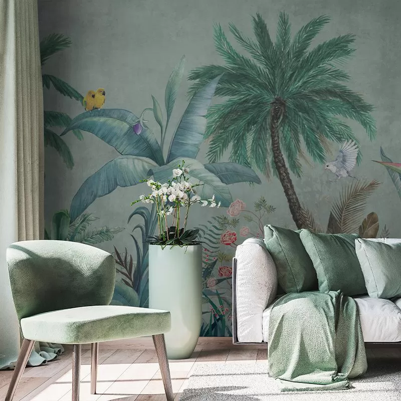 Adăugați o notă tropicală elegantă în casa dumneavoastră cu Gentle Leaves, un tapet cu frunze delicate de palmier care creează