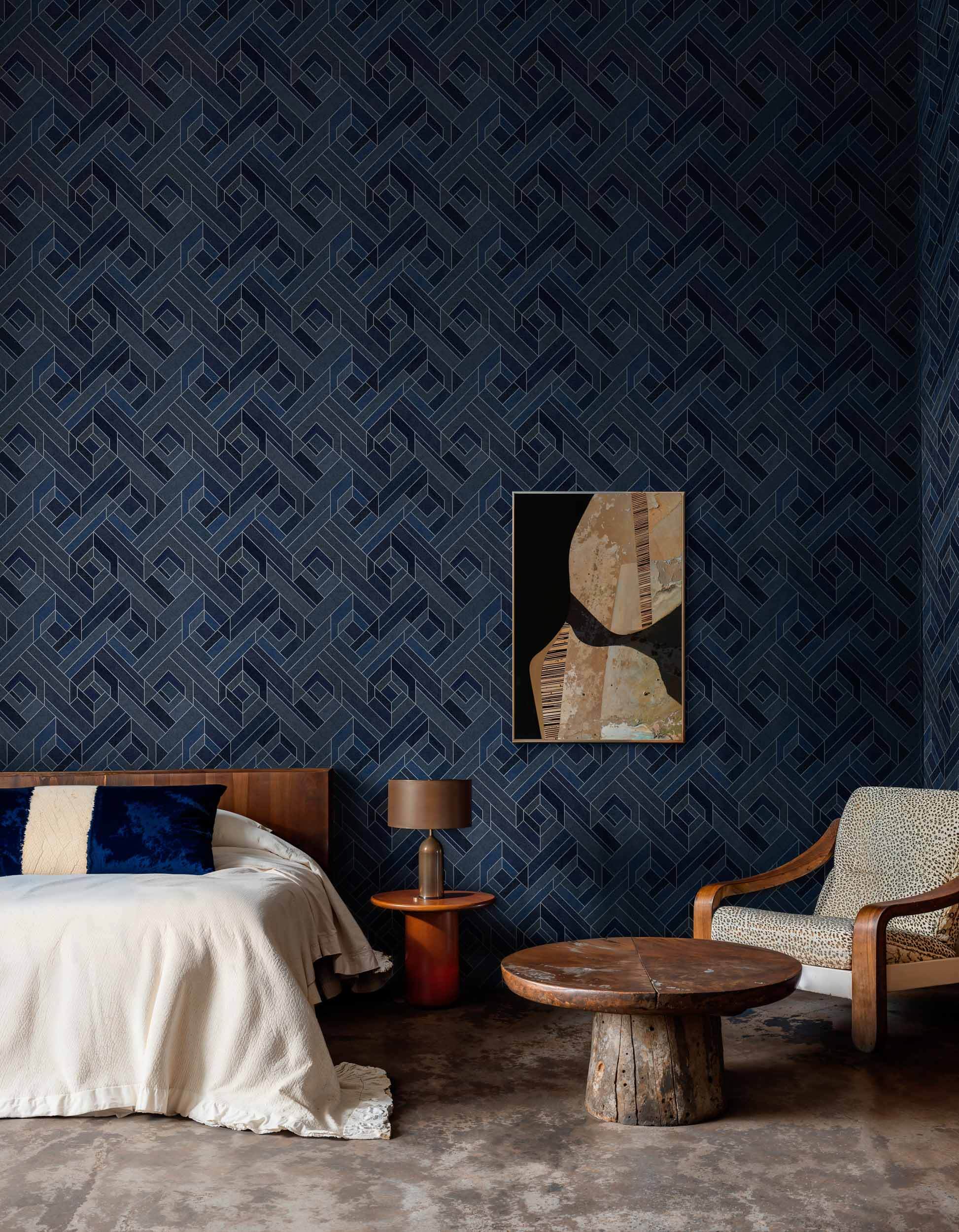 Transformă-ți casa cu acest tapet modern! Designul geometric în nuanțe de ultramarin adaugă un plus de eleganță și stil oricărei încăperi. Ideal pentru living, dormitor sau birou.