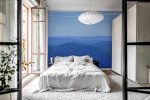 Nori albi, pufoși, pe un cer albastru, într-o imagine pictată parcă în acuarelă. Un fototapet care va oferi o atingere
