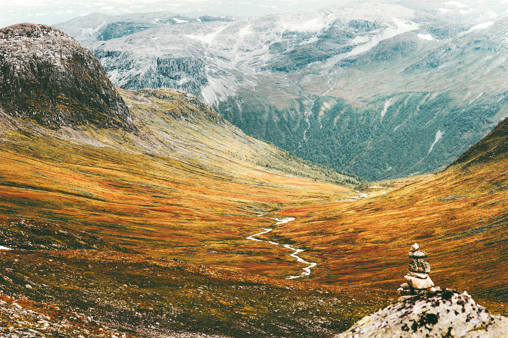 Jotunheimen este o zonă montană în mare parte neperturbată din estul Norvegiei. Numele înseamnă „casa giganților”. Acestă tapet afișează o priveliște frumoasă, neatinsă de omenire, cu excepția unui mic detaliu. Îl poți observa?