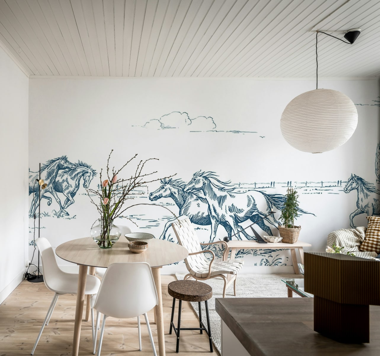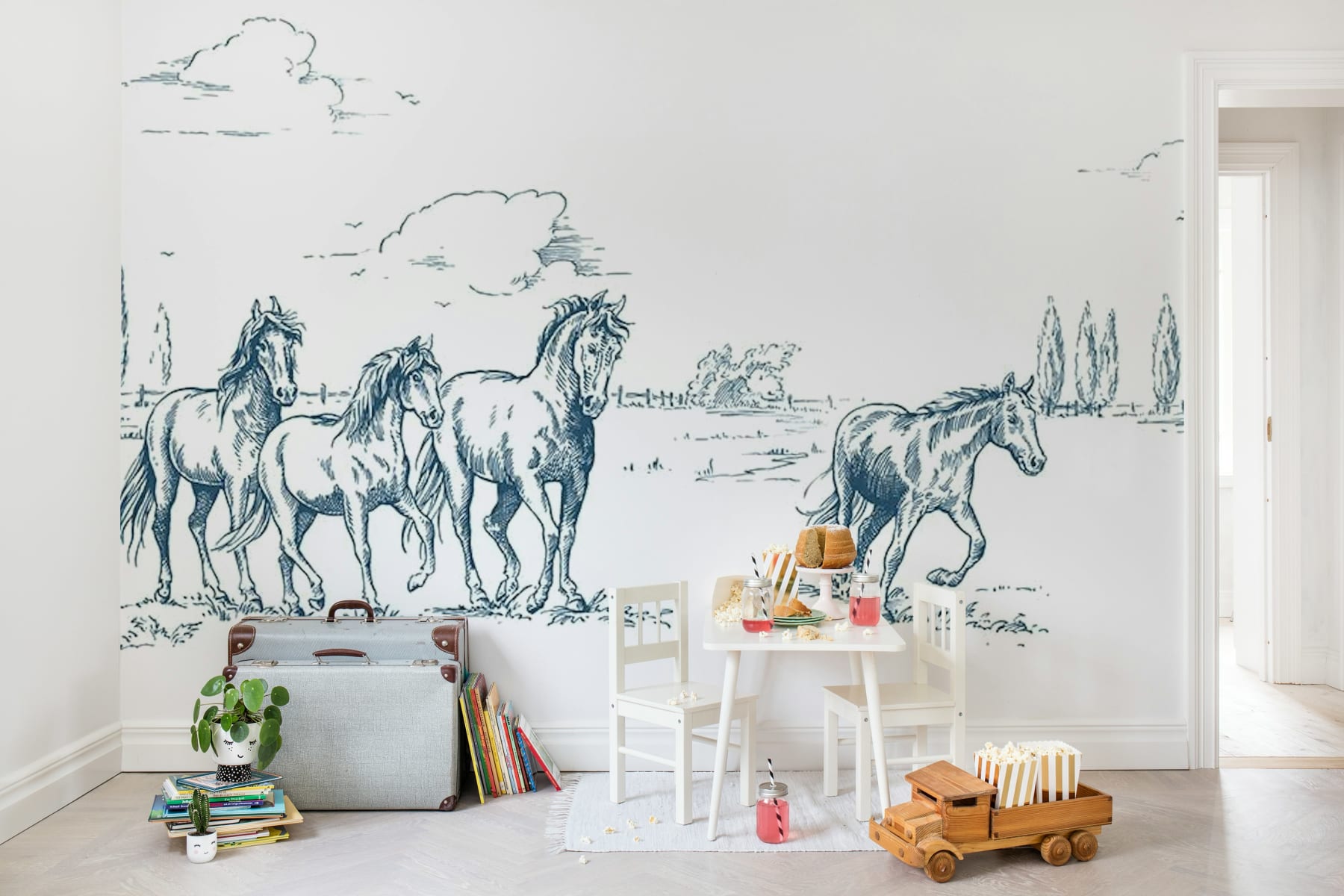 Eliberează energia dinamică a libertății cu tapetul nostru Horses Herd Grand, Blue. Capturând frumusețea maiestuoasă a cailor în mișcare, această piesă impresionantă aduce un sentiment de noblețe și grație sălbatică în orice spațiu. Stilul schițat, pe un fundal albastru, creează o experiență vizuală care este deopotrivă liniștitoare și exaltantă. Ideal pentru un perete accent, acest design invită spiritul câmpului deschis și al acestor creaturi nobile în casa ta, oferind o doză zilnică de inspirație. Lasă-ți imaginația să zburde liber cu eleganța frumuseții ecvestre!