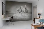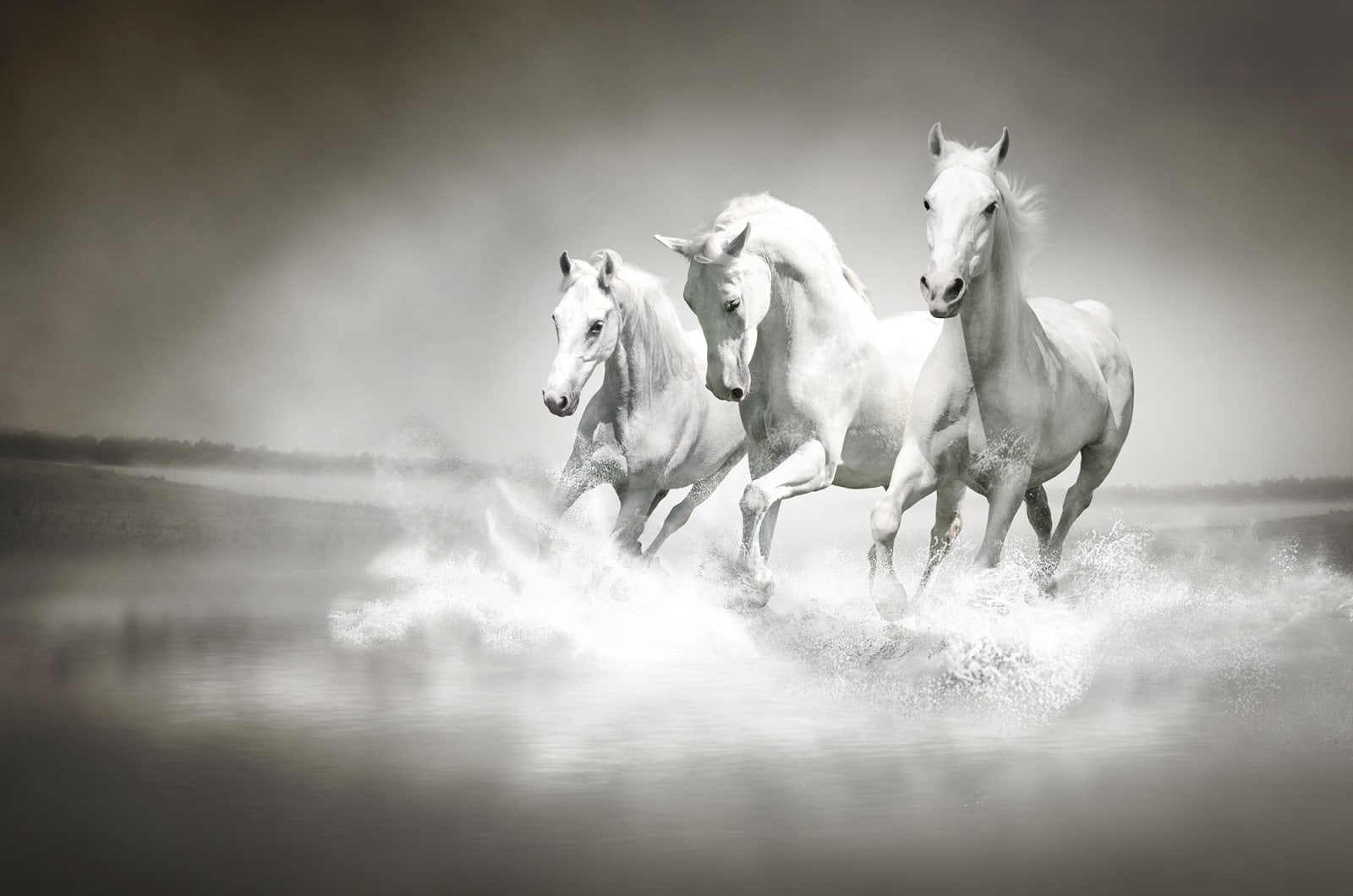 Cai albi fugind prin apă, un frumos fototapet în nuanțe de gri.