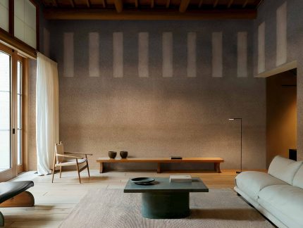 Tapetul Lin Ocre de la Coordonné este un design texturat în tonuri de galben/portocaliu din colecția Palette. Nuanțe calde de