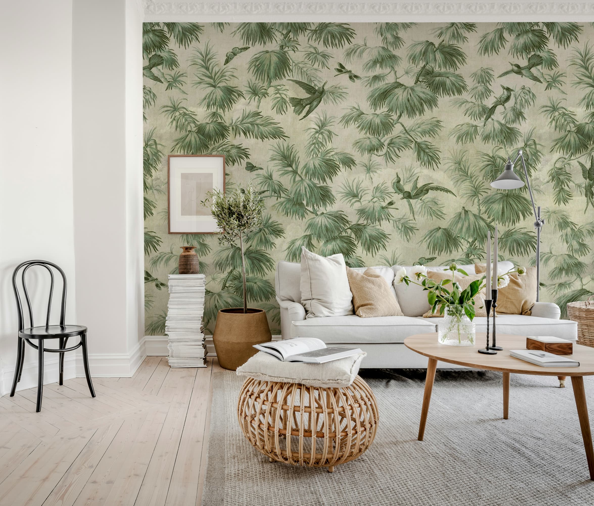 Creează un spațiu relaxant cu acest tapet cu design tropical! Ideal pentru livinguri și dormitoare, aduce un aer proaspăt și elegant.Instalează-l ușor și transformă-ți casa într-o oază de verdeață.