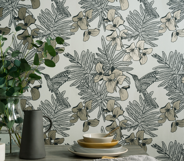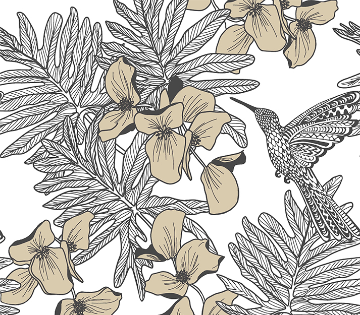 Tapetul Hummingbird este împodobit cu o serie de păsări, flori și frunze, aducând natura tropicală în casa ta. Designul botanic desenat în linie are blocuri colorate de argintiu auriu metalizat pentru un aspect modern de lux. Un tapet monocrom remarcabil, care oferă un escapism exotic.