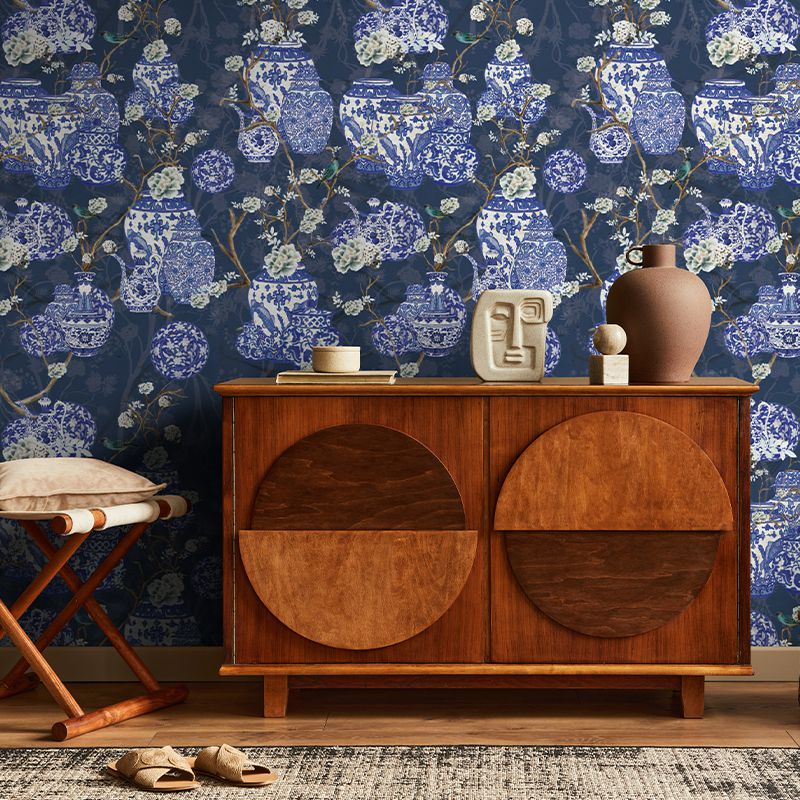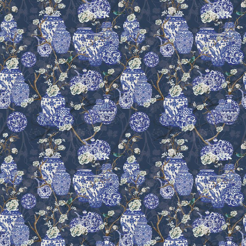 Adăugați o notă de eleganță și rafinament spațiului dvs. cu acest tapet cu un design floral bogat și inspirat din cultura asiatică. Culorile albastre și albe delicate se îmbină perfect cu nuanțele subtile de gri, creând o atmosferă relaxantă și sofisticată. Motivarea tapetului prezintă o colecție de vaze chinezești decorate cu flori și păsări, evocând o senzație de armonie și natură. Acesta este tapetul perfect pentru a adăuga un strop de personalitate și stil camerei dvs. de zi, dormitorului sau biroului.
