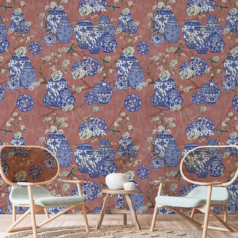 Acest tapet cu un design floral elegant, prezentând vaze chinezești albastre și albe pe un fundal roz prafuit, aduce o notă de rafinament și stil oriental în orice încăpere. Motivarea unică, cu detalii delicate de flori și păsări, creează o atmosferă relaxantă și sofisticată. Tapetul este perfect pentru a decora livingul, dormitorul sau biroul, adăugând o notă de eleganță și rafinament spațiului.