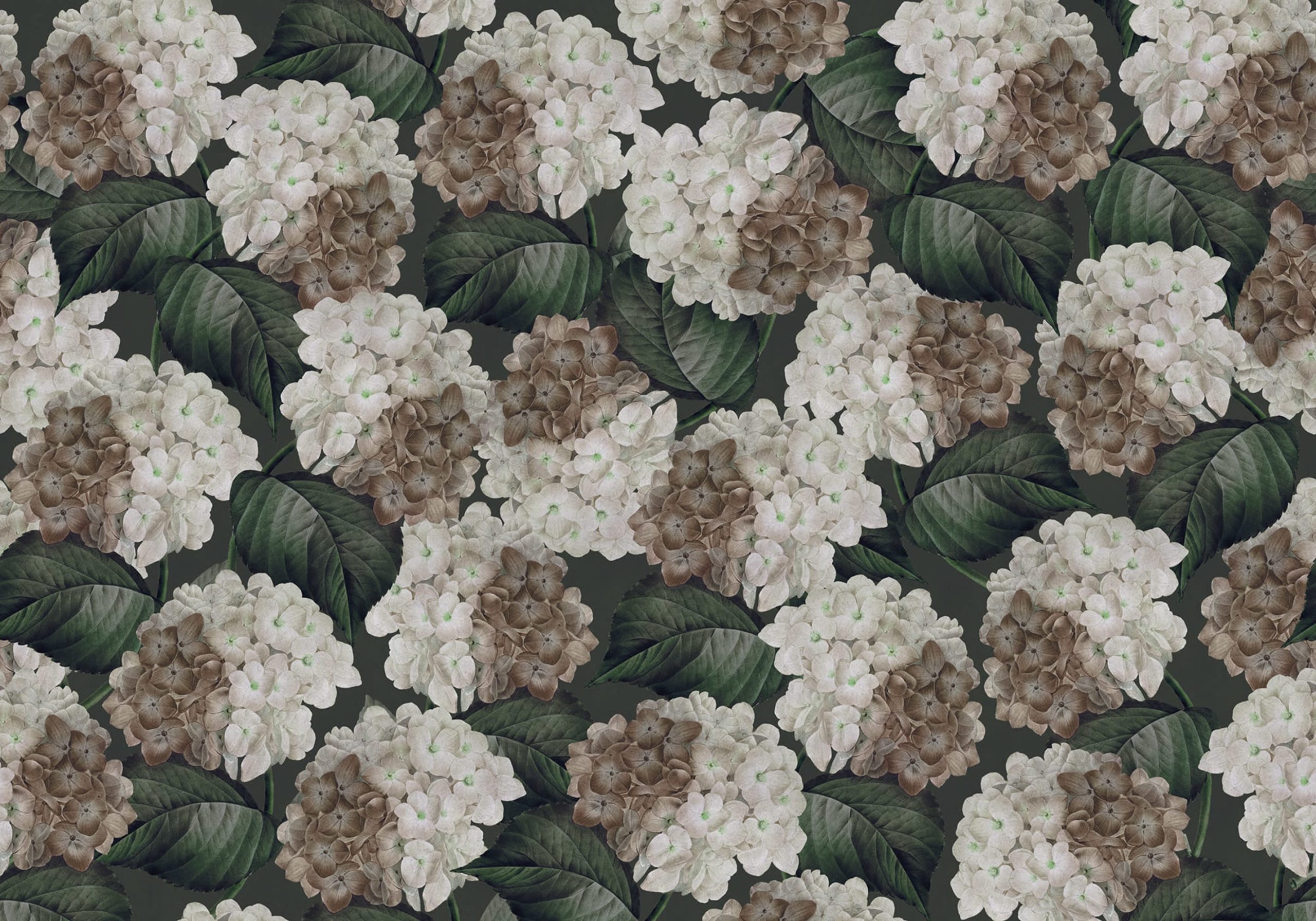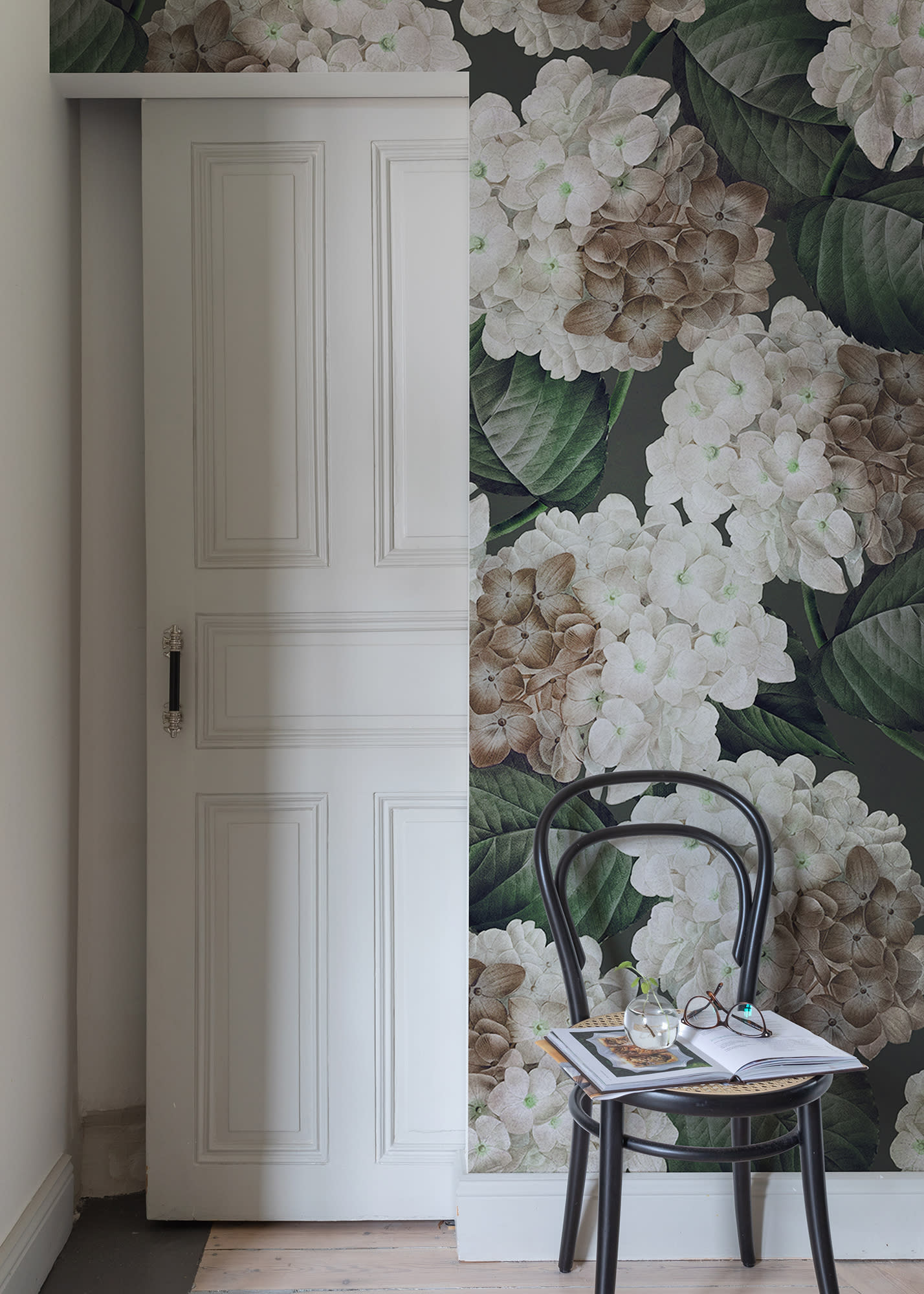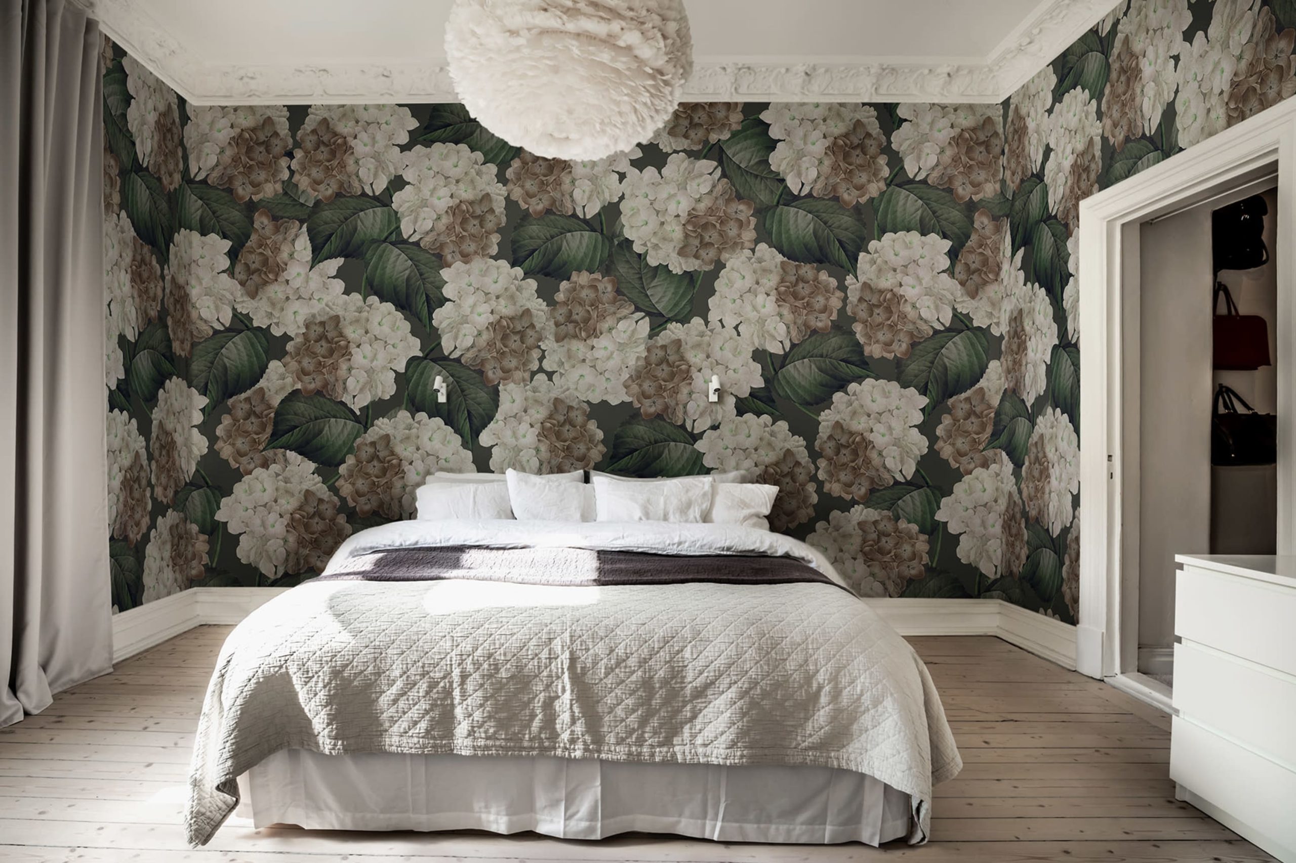 Această model cu hortensii mari acoperă peretele cu o îmbrățișare caldă și moale și oferă un efect wow, dar într-un mod mai blând. Varianta Midnight aduce nuanțe minunate de alb, maro și verde pe un fundal verde închis. O adevărată bijuterie!