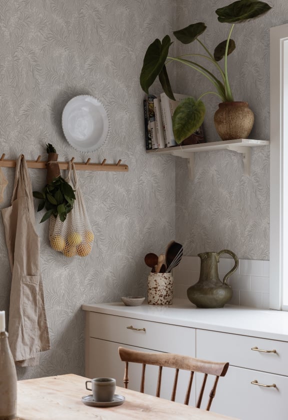 Un imprimeu botanic cu catină bogată în fructe pline de vitamine care se imprastie pe perete. Frunzele formează mici pene frumoase ca frunzele de palmier și oferă camerei o senzație exotică într-un caracter nordic.