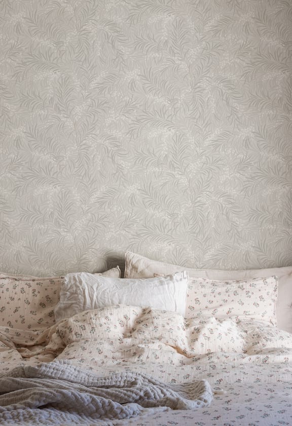 Sanna light blue este un tapet decorat cu flori de mazăre dulce care plutesc grațios pe deasupra peretelui. Floarea a