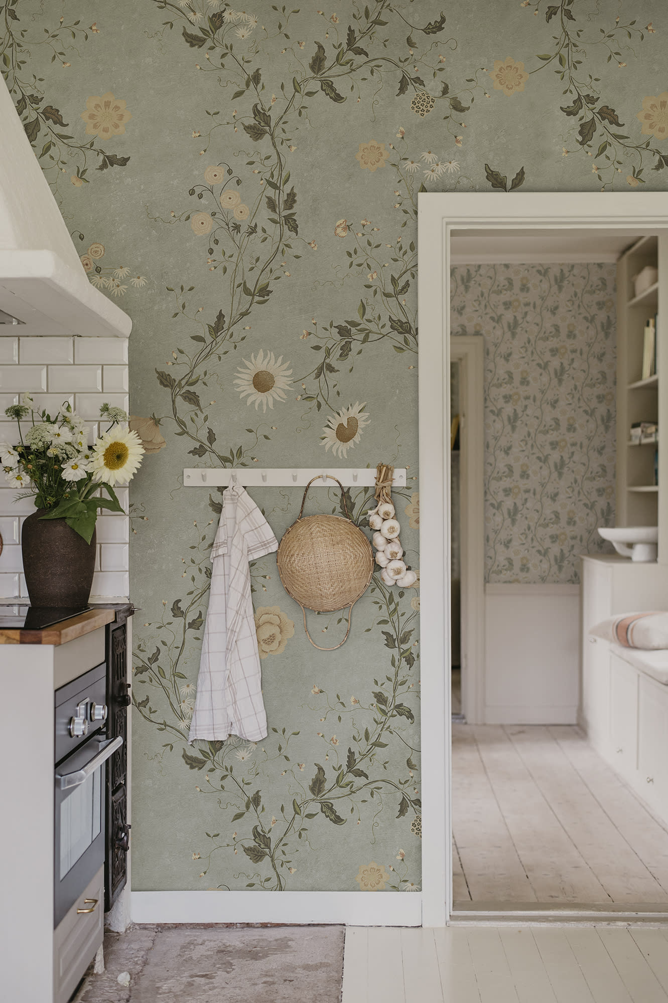 O simfonie florală delicată pictată manual, creată în colaborare cu @snickarglädjen, prezintă unele dintre preferatele ei din grădină. Floarea-soarelui, dalia, aster de pădure și mazărea dulce se împletesc pe o suprafață de piatră brută erodată, creând un aspect vintage contemporan frumos. Inger, Light Blue, este îmbrăcată în cele mai drăguțe nuanțe de albastru, verde, roz, galben și alb.