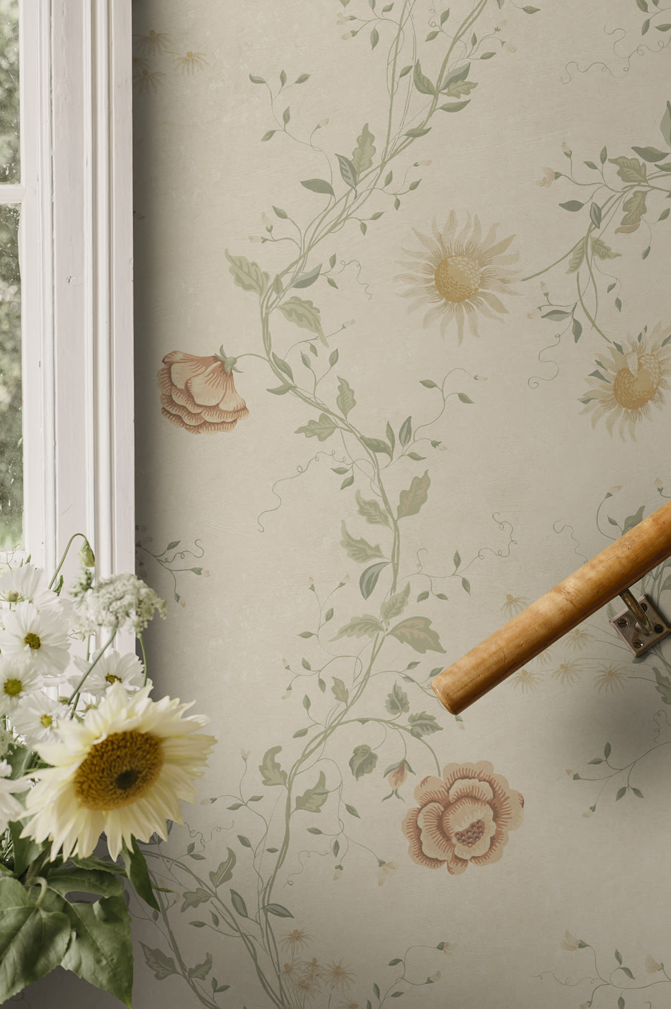 O simfonie florală delicată pictată manual, creată în colaborare cu @snickarglädjen, prezintă unele dintre preferatele ei din grădină. Floarea-soarelui, dalia, aster de pădure și mazărea dulce se împletesc pe o suprafață de piatră brută erodată, creând un aspect vintage contemporan frumos. Schema de culori pastel prezintă cele mai frumoase nuanțe pastelate de bej, verde, roz și galben.