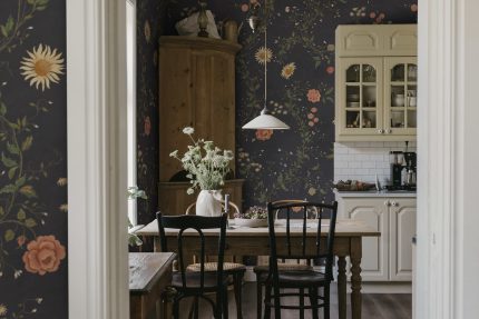 Tapetul Sigfrid blue are un model de frunze dens, care se întinde pe perete și dă camerei un aspect armonios.