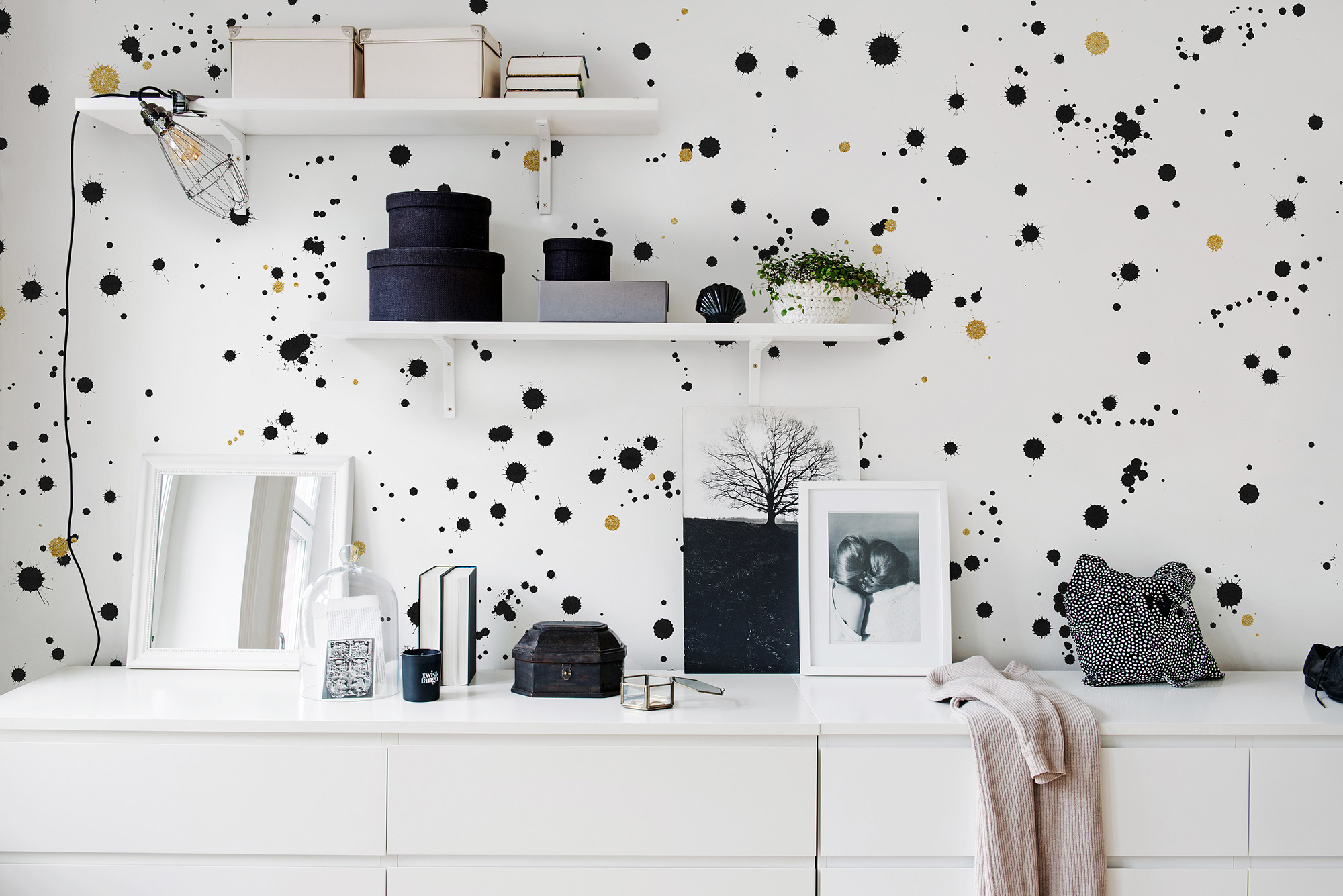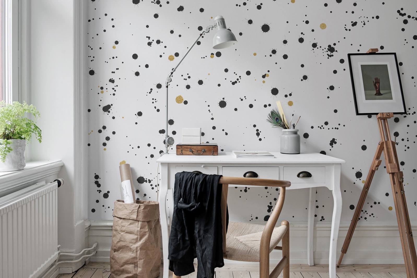 Pete spontane de culoarea aurie combinate cu modelul clasic de buline. Acest fototapet este diferit și va adăuga dinamică oricărei încăperi, dar în mod special celor decorate în stilul tradițional. Îndrăznești să adaugi puțină dramă designului interior?