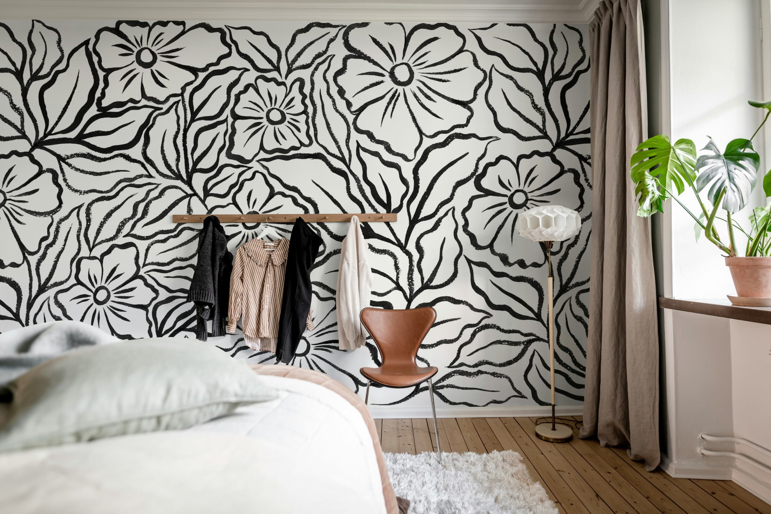 Creează un impact vizual puternic cu acest model floral îndrăzneț. Ideal pentru a adăuga un element artistic și modern oricărui spațiu. Un fototapet elegant, cu flori stilizate negre pe fond alb.