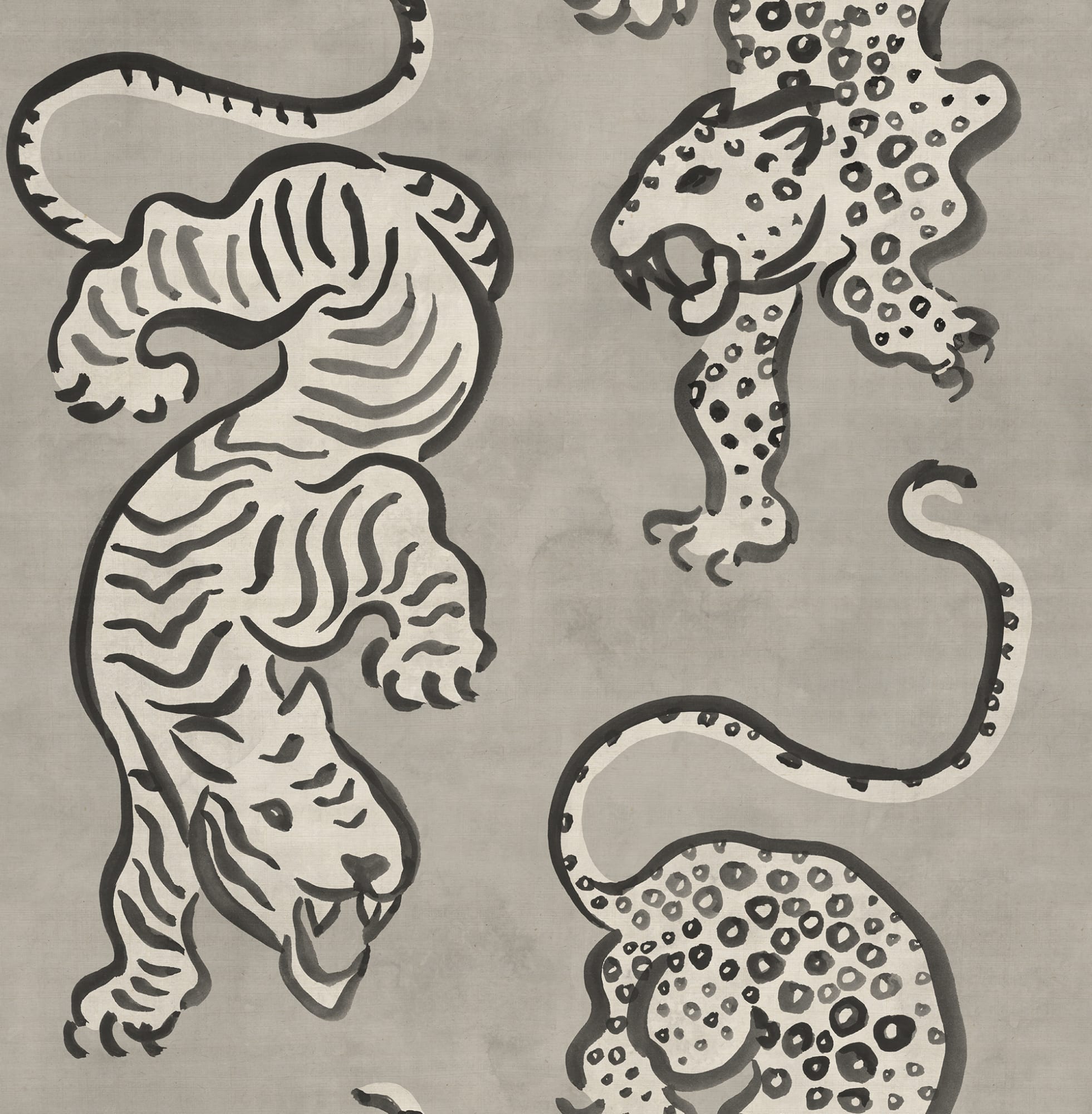 Revendicați-vă spațiul cu frumusețea tigrilor și leoparzilor de cerneală, capturați în gri cu finețe de pensulă. Acest tapet îmbină arta clasică asiatică a cernelii cu flerul modern, creând un flux dinamic pe pereții dvs. care emană echilibru și putere.