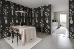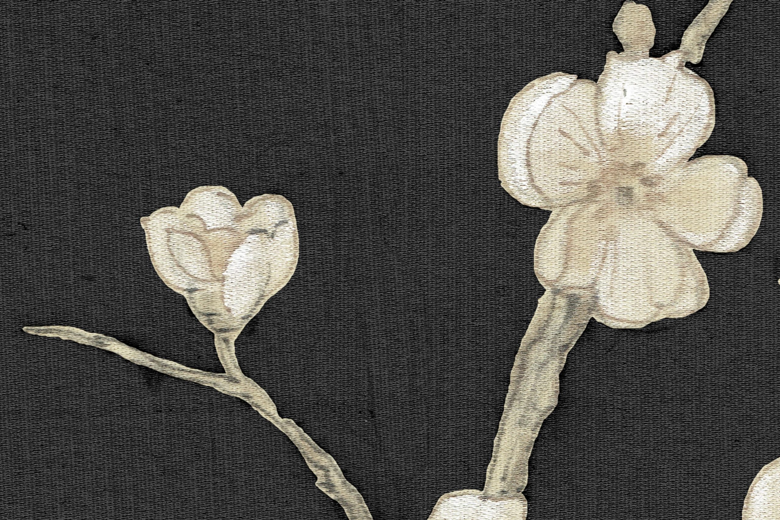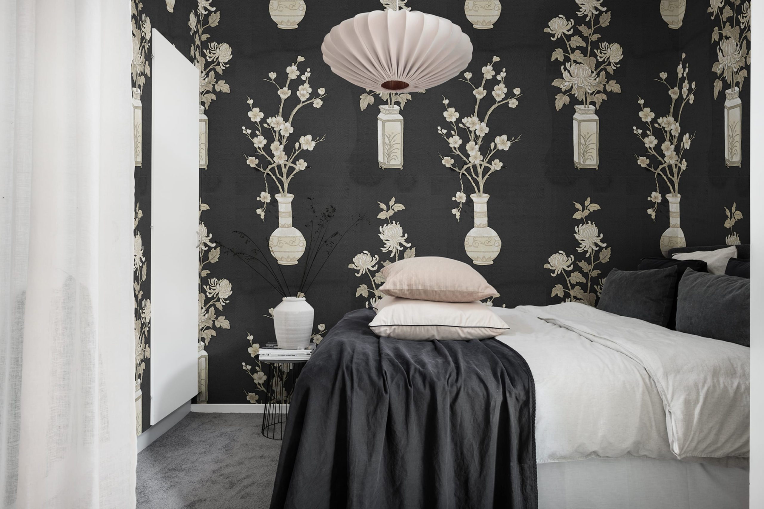 Acest design este inspirat din stilul Japandi și din alte stiluri asiatice, dar cu ceva în plus. Vazele pictate manual cu flori de cireș și crizanteme formează un model mare simetric pe o suprafață structurată. Dimensiunea designului și modul în care se avântă în sus deschid camera și o fac să se simtă mai extinsă și mai aerisită.