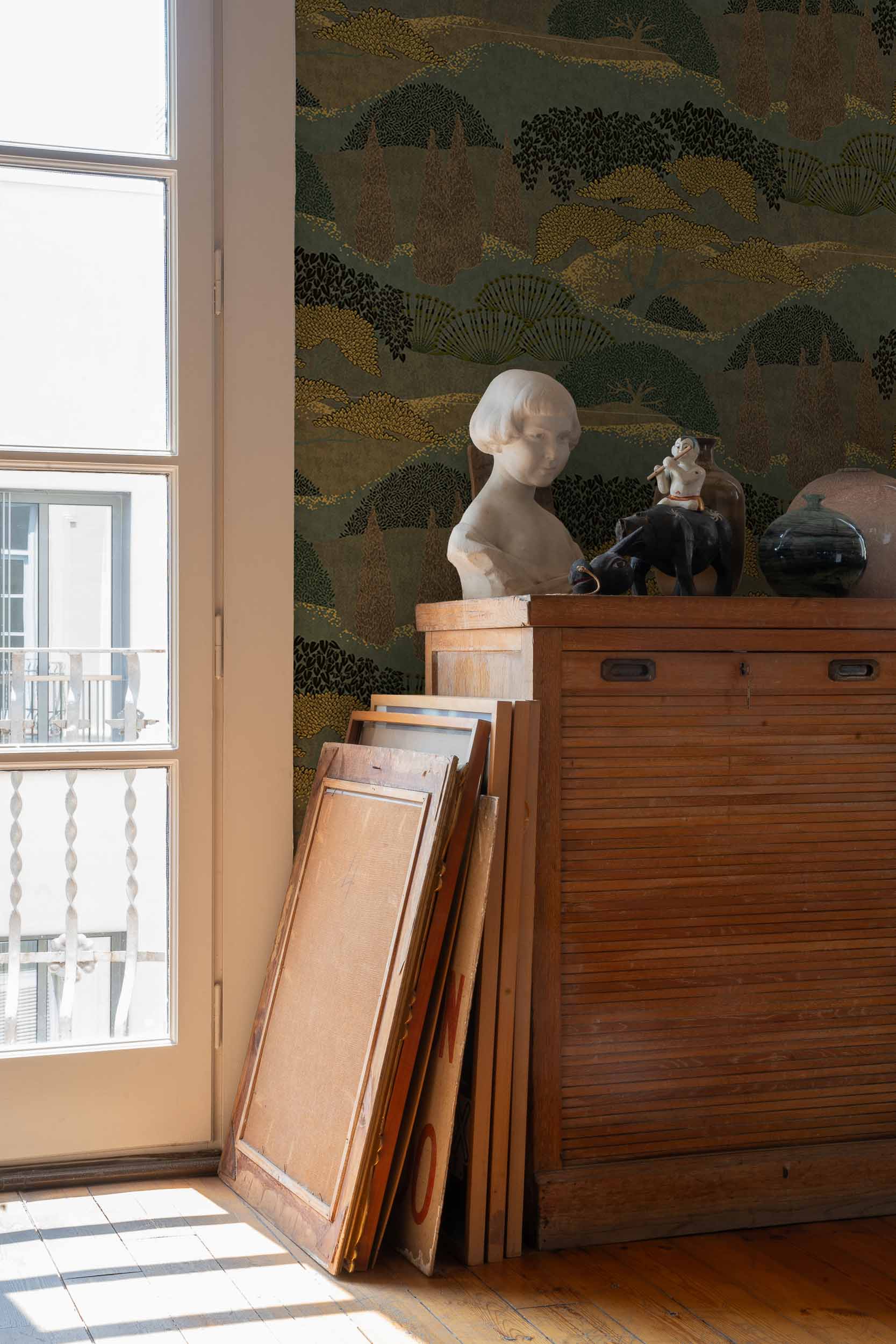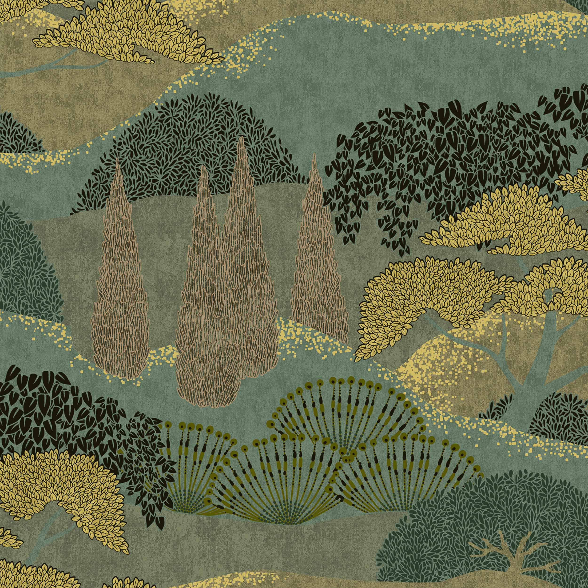 Jardín Japonés, Menta, din colecția Lur, este un design vegetal, în nuanțe de verde. Plantări contemporane sub forma unor terase cu chiparoși pictați pointilist.