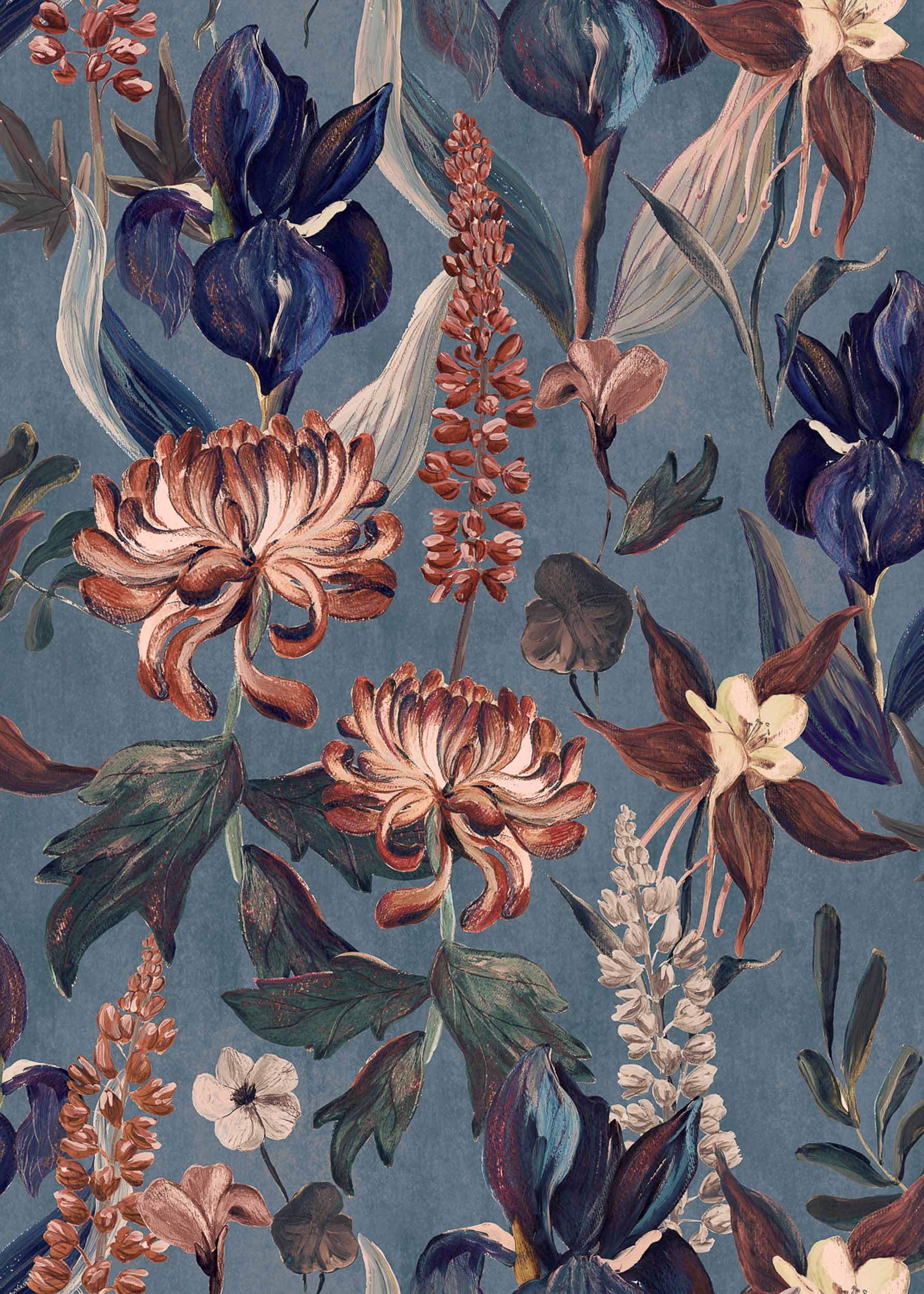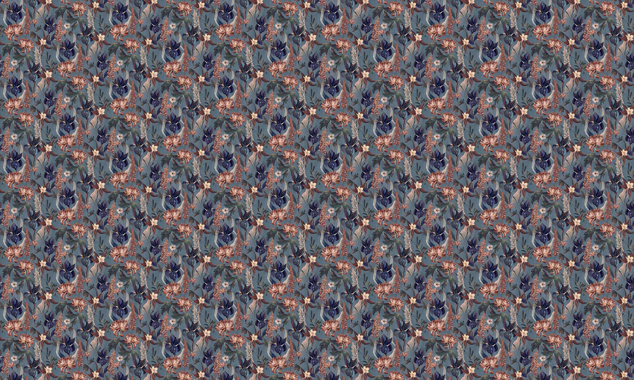 Jardín Rojo, Añil, din colecția Lur, este un design floral, în nuanțe de albastru/bleumarin. Flori spectaculoase în nuanțe de roșu aprins unde crizantemele grandioase sunt în centrul atenției.