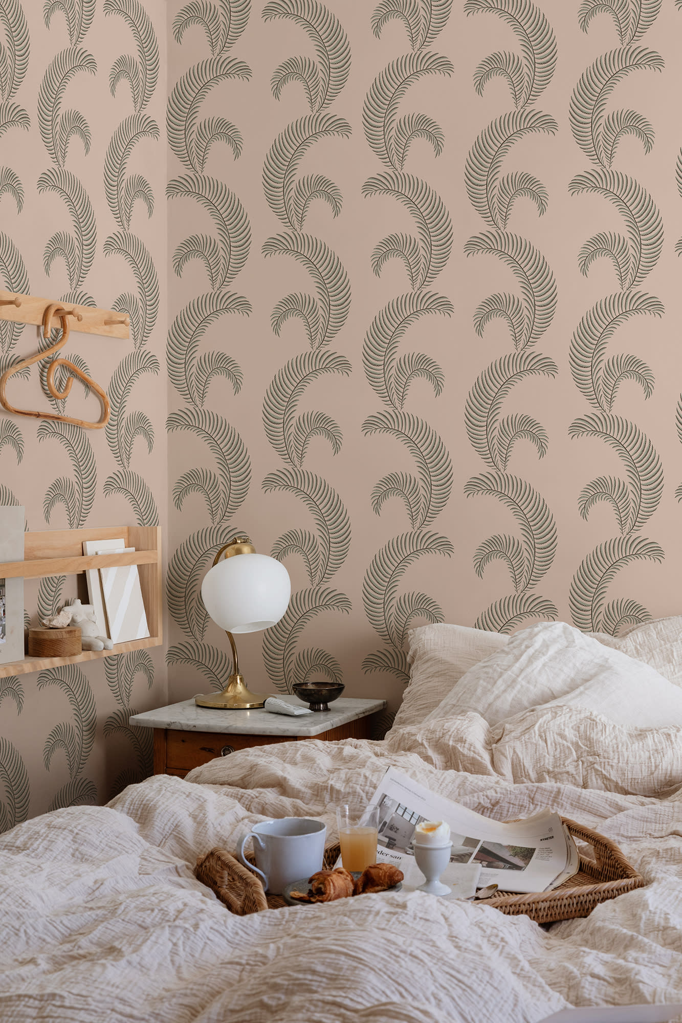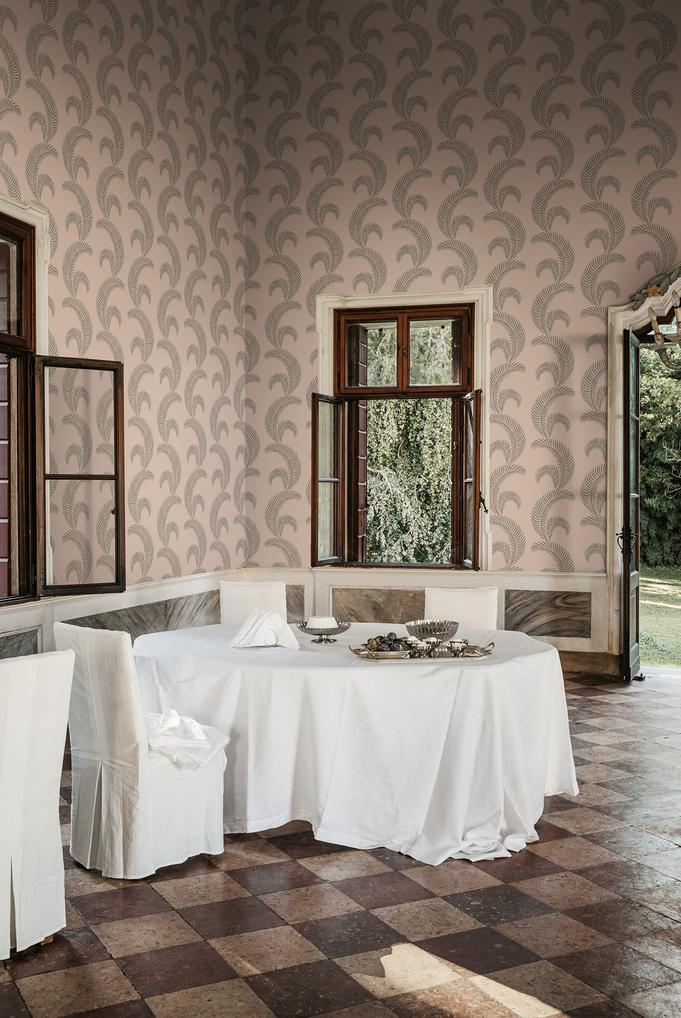 Sofisticate cu o margine stilizată, aceste frunze de palmier grafice conferă o atmosferă elegantă și luxoasă camerei. Jasmine, Pink prezintă un fundal roz moale cu nuanțe de verde și maro.
