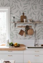 Un model frumos cu frunze la scară largă. Frunzișul frunzelor de dafin creează o expresie organică pe pereții tăi.