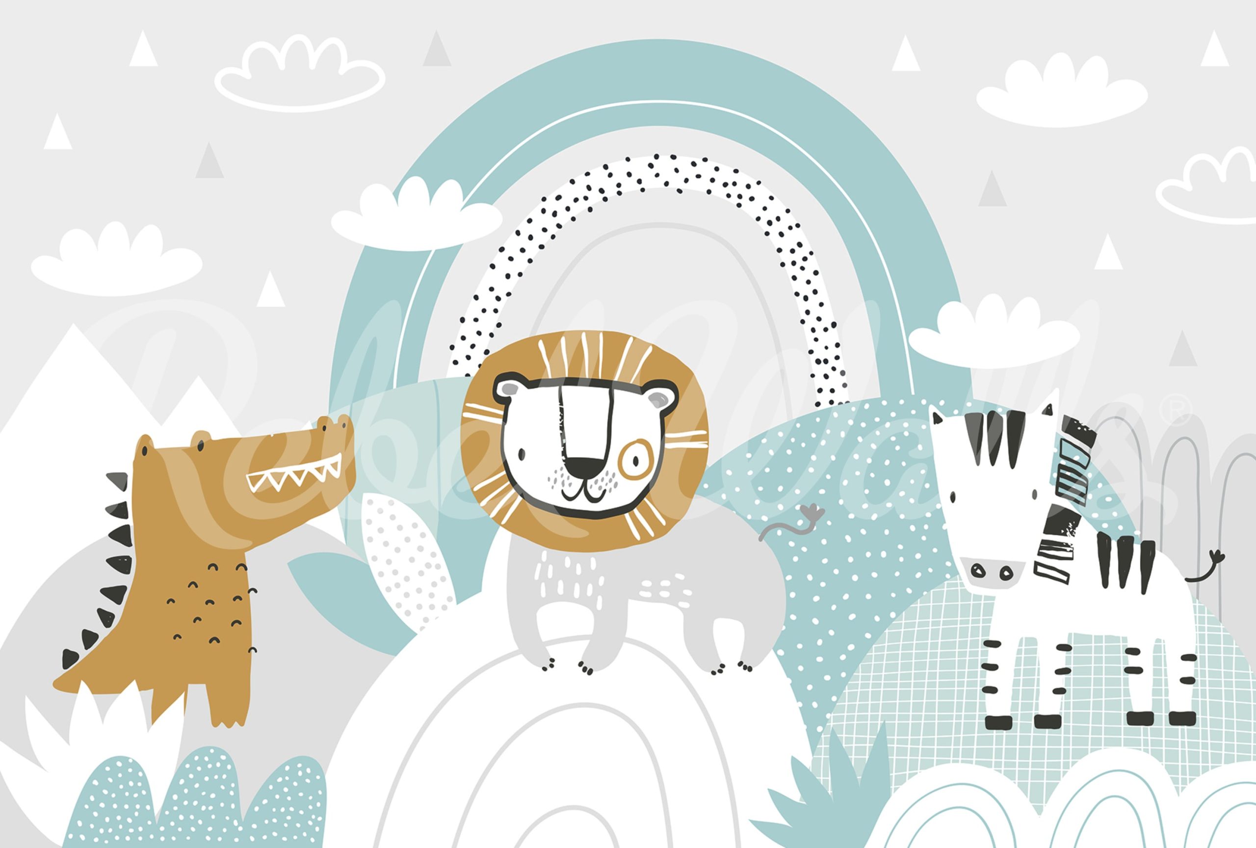 Prietenii Safari: Lăsați imaginația copilului să zburde cu tapetul Jolly Jungle, Soft. Acest design încântător prezintă animale prietenoase din junglă și curcubee vibrante, perfecte pentru un mediu distractiv și educativ.