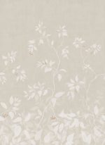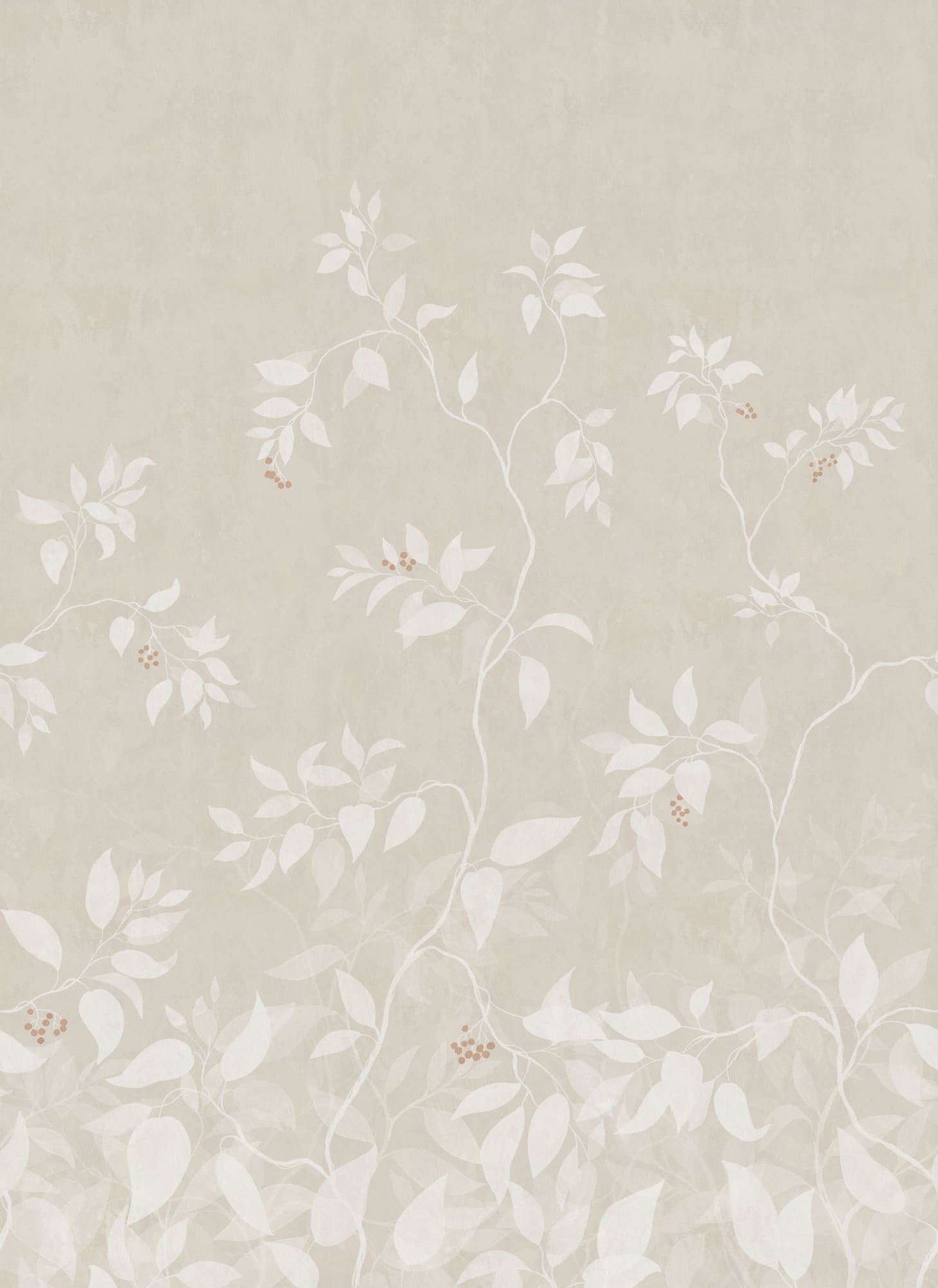 O pictură murală în acuarelă cu tulpini delicate și complicate care urcă grațios pe perete, oferind un sentiment liniștitor de profunzime. Josefine, Sandstone, prezintă frunze de culoare bej-nisip și boabe roșii teracotă pe un fundal bej moale.