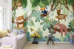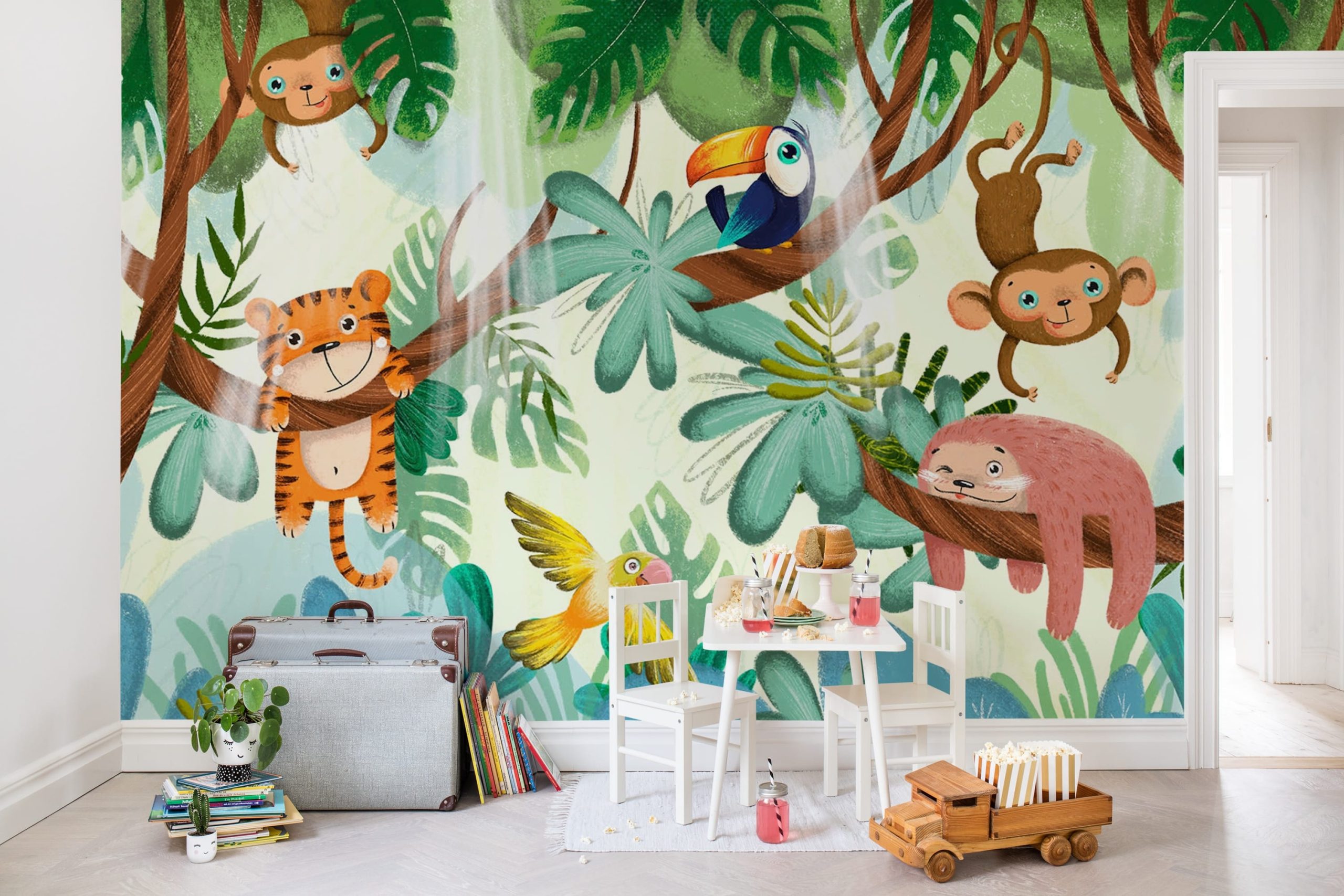 Transformă camera copilului tău într-o aventură în junglă cu „Jungle Buddies, Green”. Acest tapet prezintă o bandă veselă de animale care se joacă printre crengi tropicale, desenate într-un stil menit să stârnească bucurie și să aprindă imaginația.