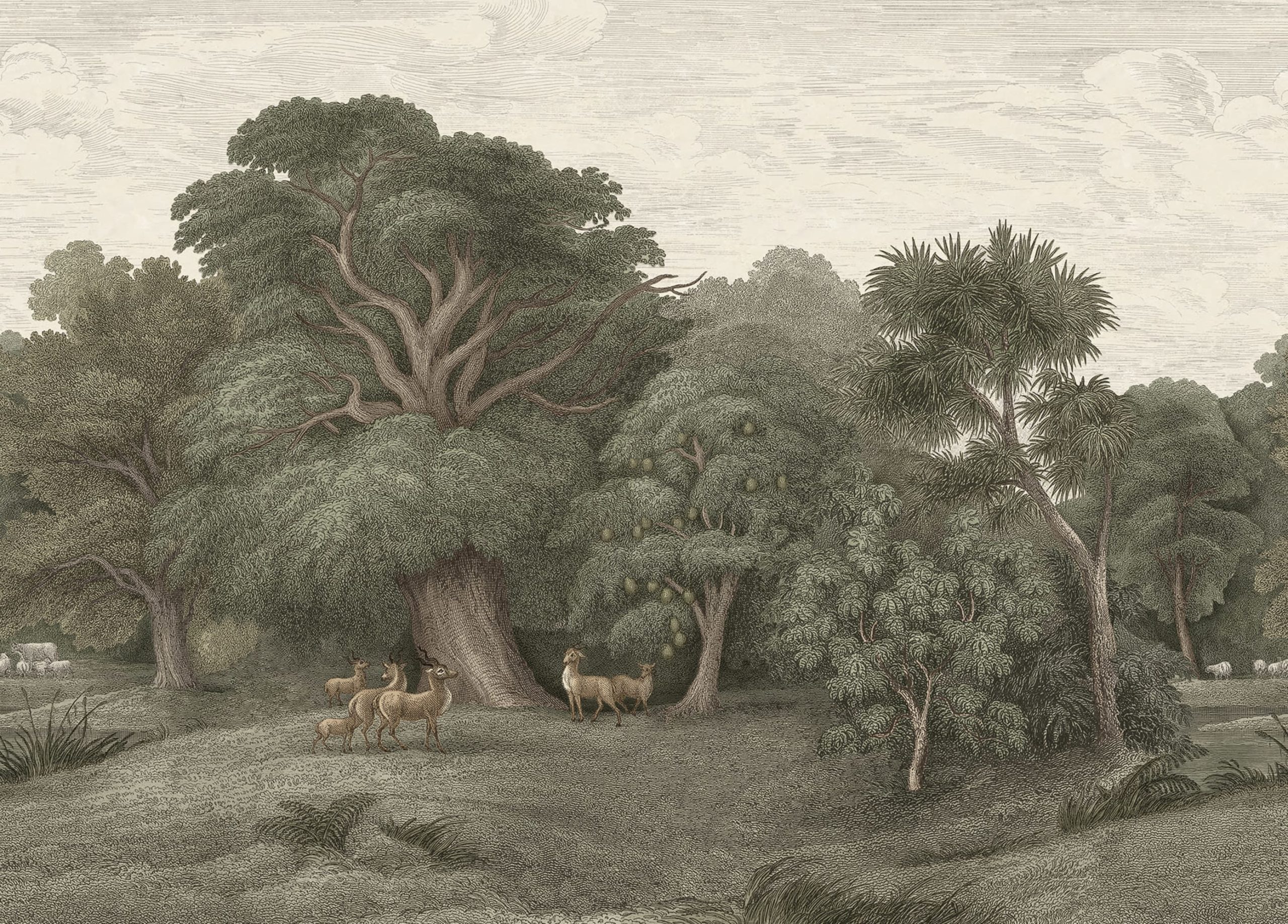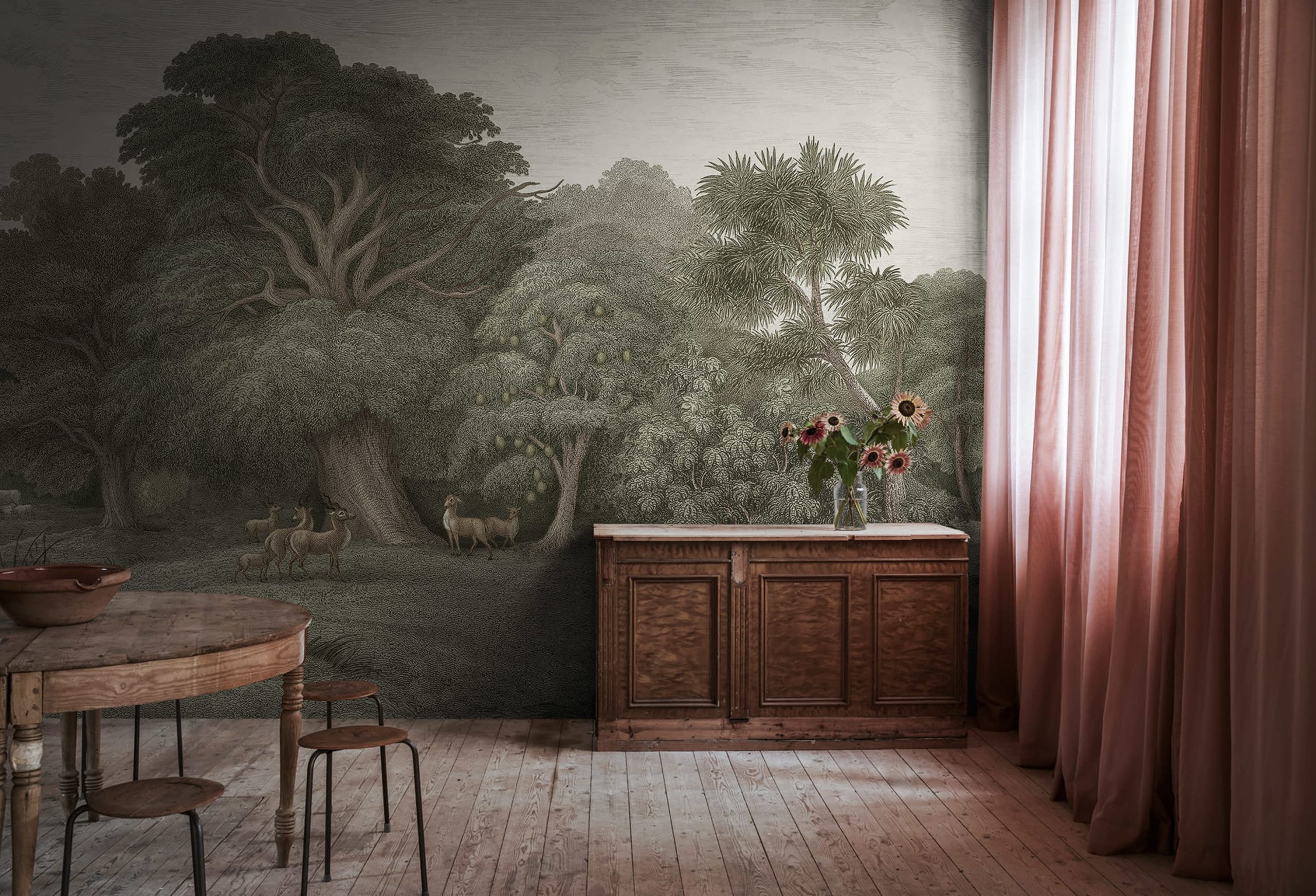 Verdeață densă în adâncimea junglei, pictată cu culori subtile, estompate. Acest mural povestește despre viața în junglă, lângă ochiul de apă. O evadare tropicală liniștitoare în verde cald și bej.